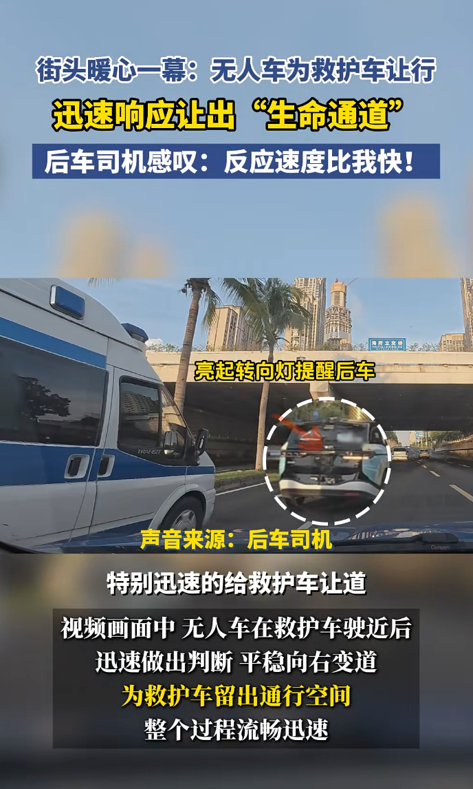 还有一次我刷到萝卜快跑给后面救护车让出“生命通道”,响应变道甚至特迅速,看着相当暖人心。