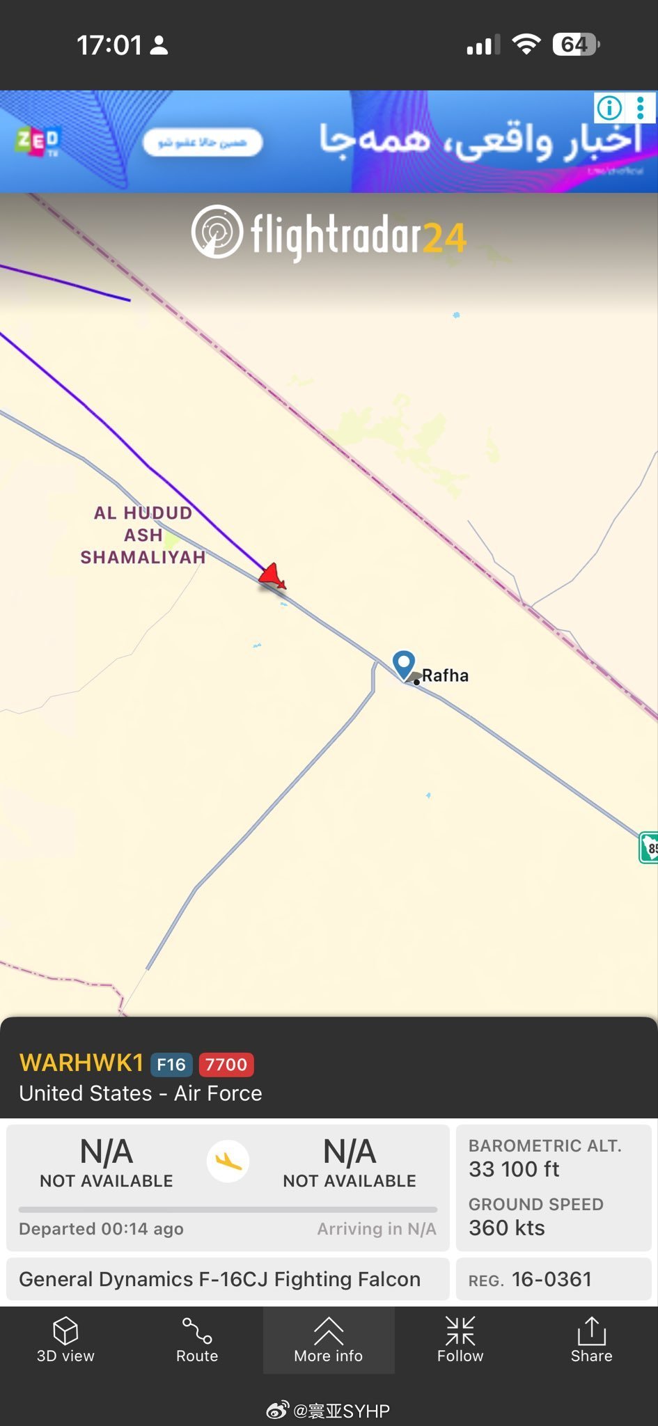 一架美国空军 F-16CJ战机离开伊朗之后,在伊拉克与沙特边境空域,并发出7700紧急代码——这是通用的空中紧急情况代码,表明飞机出现问题。