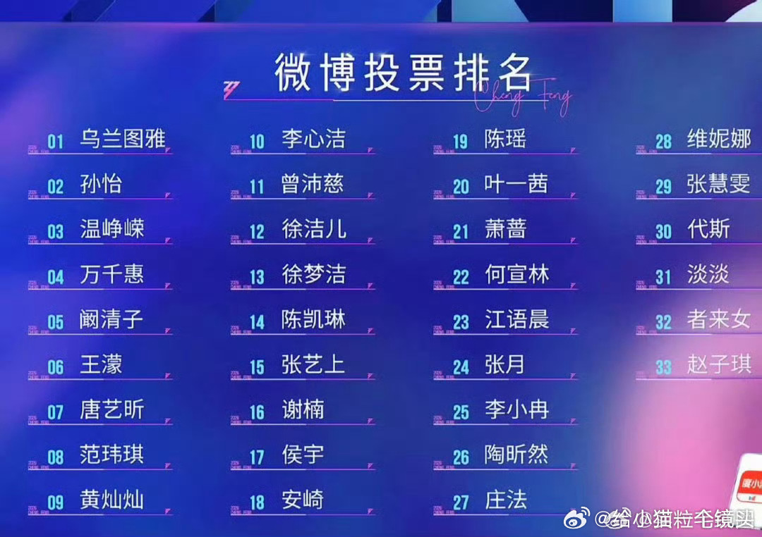浪姐排名【淘汰人选】X第八组 黄灿灿 何宣林第七组 唐艺昕:421 ✔ 陶昕然:345第六组 王 濛:379 庄 法:382✔第五组 阚清子:480✔ 张艺上:348第四组 万千惠:448✔ 赵子琪:371第三组 温峥嵘:433✔ 代 斯:324 第二组 孙 怡:477 ✔ 江语晨:358第一组 乌兰图雅:479✔ 范玮琪:416乘风2026初舞台PK分组及票数