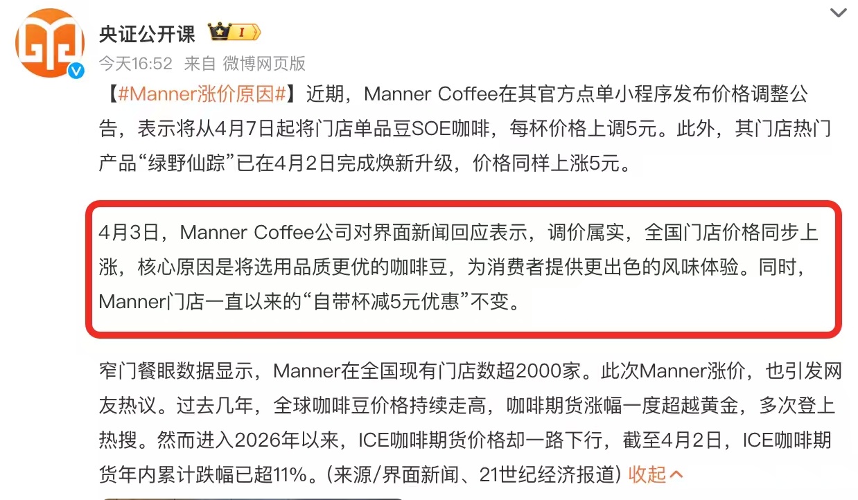manner涨价原因涨价肯定是有原因的,为什么涨价?是因为选择了更优质的咖啡豆。