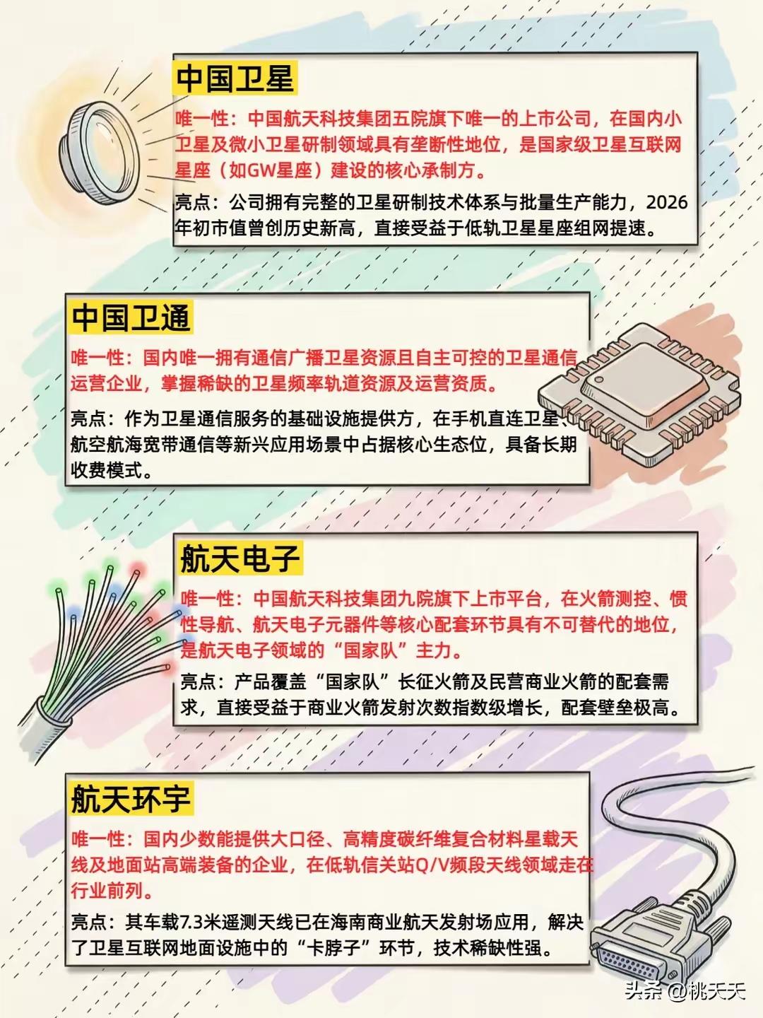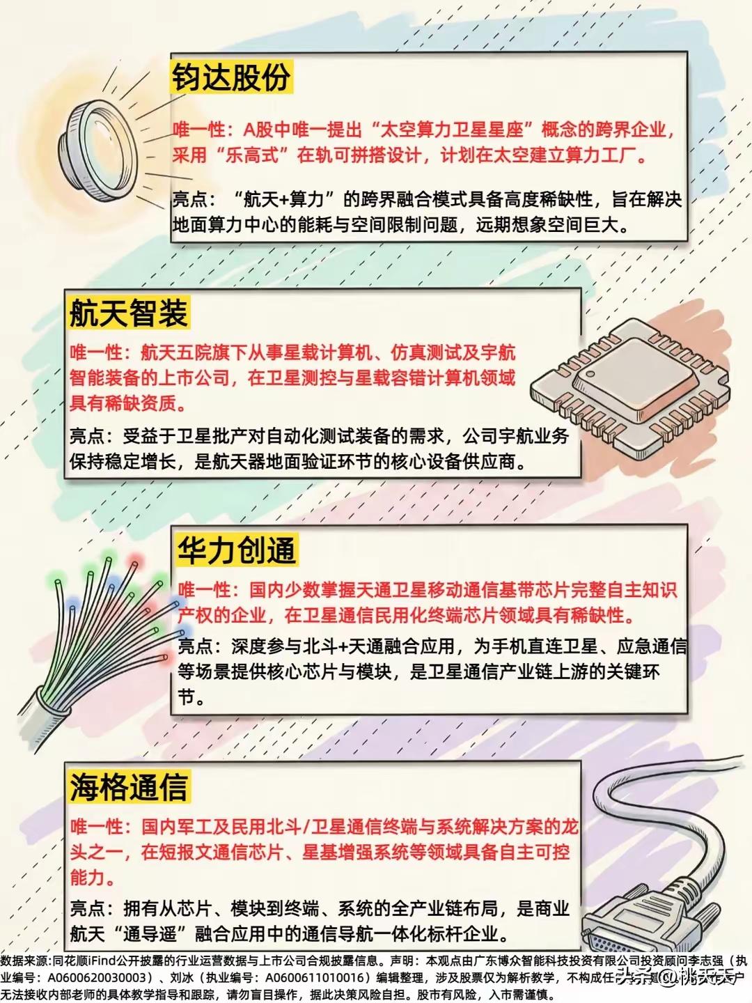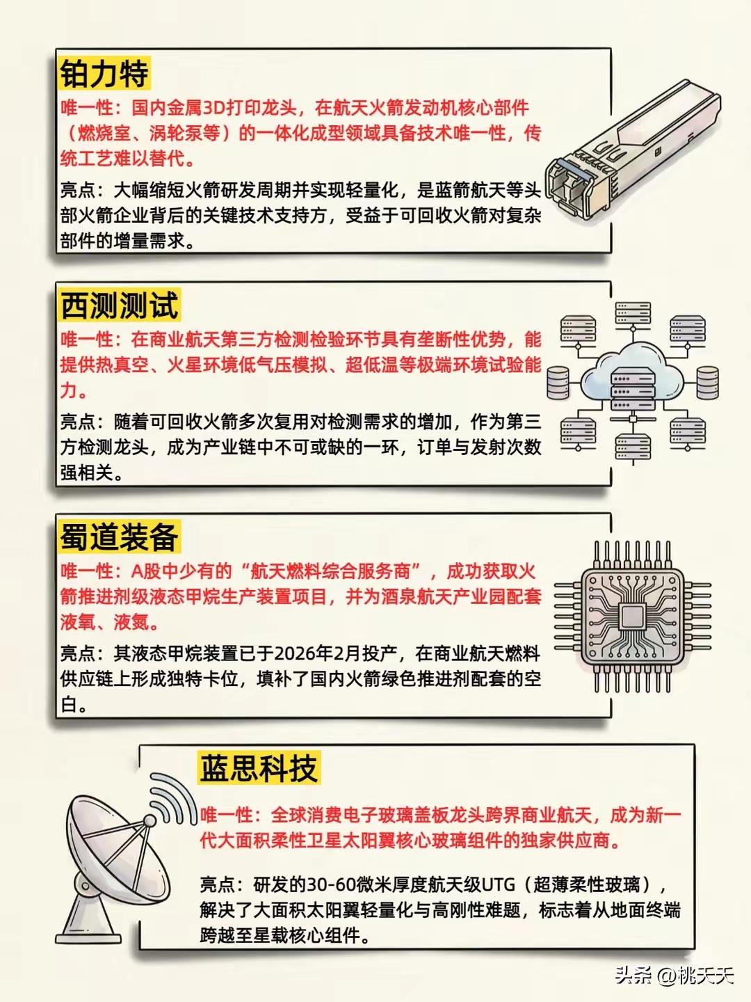 想在商业航天里找能打的?这12只龙头得拎出来说道说道,每只都有自己的独门本事,错过可能真得拍大腿。 先看卫星和航天直接相关的—— 铂力特,3D打印玩得溜。火箭上不少复杂零件,传统工艺造起来又慢又贵,它家能用3D打印一次成型,成本砍半还不影响性能,现在好多航天厂都指着它供货,这技术在国内没几家能比。 西测测试,给火箭卫星做“体检”的。发射前所有设备都得经它手测一遍,强度够不够、信号稳不稳,过不了它这关别想上天。这行就讲究一个“零失误”,它的检测报告就是通行证,别人想抢也抢不走。 中国卫通,手里攥着卫星通信的“黄金频段”。咱们手机想直连卫星,信号得靠它家的卫星中转,就像地面上的基站,位置占得早,别人再想挤进来难上加难。现在户外探险、远洋航行都得用它的服务,刚需摆在这儿。 航天智装,给卫星装“千里眼”的。它家的遥感载荷能让卫星把地面看得清清楚楚,小到农田墒情,大到森林火灾,数据准得很。现在自然资源、应急管理都离不开,订单根本停不下来。 海格通信,卫星通信的“翻译官”。地面设备和卫星说话得靠它家的终端解码,军用民用都吃得开。尤其在偏远地区,没它信号就断了线,这技术壁垒可不是一天两天能攻破的。 航天电子,火箭的“神经中枢”。箭上的控制系统、导航设备几乎都出自它家,相当于火箭的大脑,差一毫秒都可能偏离轨道。国内火箭发射成功率这么高,它得记头功。 华力创通,手机直连卫星的“关键拼图”。它家的芯片能让普通手机接收卫星信号,不用换专门设备,以后爬山、航海再也不怕没信号。这技术现在国内独一份,等普及开了,市场得多大想想都激动。 航天环宇,火箭结构的“搭骨架”高手。箭体的承力结构、舱段都是它家造,又轻又结实,能扛住发射时的巨大冲击力。火箭想减重提速,离了它玩不转。 中国卫星,卫星制造的“老大哥”。从通信卫星到遥感卫星,品类最全,发射数量国内第一。国家的重大航天工程几乎都有它的身影,这种国家队的底蕴,新公司根本比不了。 再看配套制造的—— 蜀道装备,给火箭“喂燃料”的。液氧、液氢这些超低温燃料,得用它家的特种设备储存运输,精度差一点就可能出危险。现在民营火箭厂都抢着和它合作,就靠这独门技术吃饭。 蓝思科技,卫星天线的“造型师”。它家能把天线做得又薄又轻,还能贴在手机、汽车上,不占地方。以后卫星终端想普及,这技术是绕不开的坎。 钧达股份,给光伏板“穿铠甲”的。卫星上的太阳能电池板得抗住太空辐射,它家的镀膜技术能让电池板寿命延长一半,现在国内外卫星厂都指定要它家的货。 其实商业航天说白了,就是把“高大上”变成“用得起”。这12家之所以能成龙头,不是靠概念炒作,而是真有别人干不了的硬本事。现在火箭发射一次比以前便宜一半,卫星应用也从天上落到地上,和咱们的生活越来越近。 普通人想看懂这赛道也简单,就看谁能把成本降下来、把应用铺开。这12只里,有的已经开始赚真金白银,有的还在蓄力,但不管哪只,能在自己的领域做到唯一,就值得高看一眼。毕竟,能把卫星送上天不难,难的是让航天技术真真切切改变咱们的生活,不是吗?