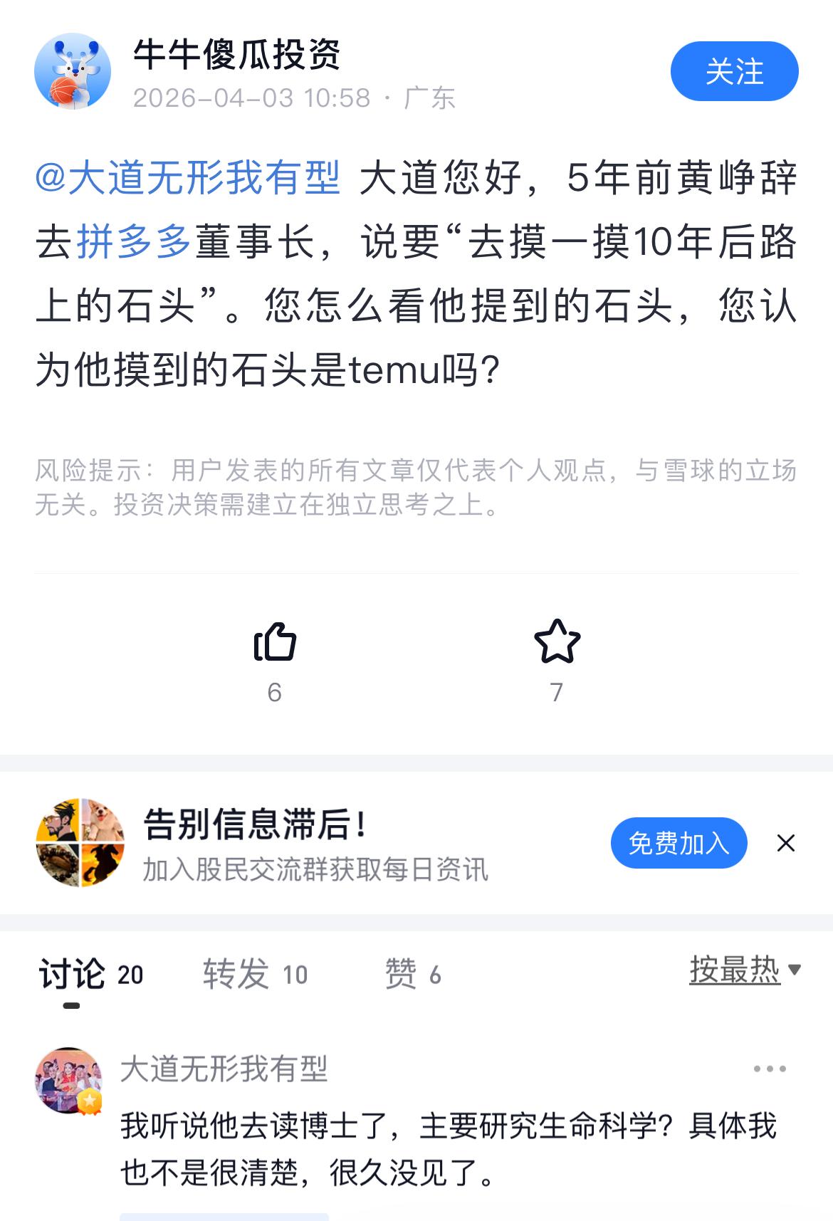 段永平透露黄峥近况:听说读博士去了,很久没见了。 据了解,黄峥2021年3月17日辞任拼多多董事长,至今已有5年有余,期间没有任何公开活动。是彻底“隐退”还是阶段性淡出江湖? 隔壁桌同事:希望2031年黄博士有一鸣惊人的举动。