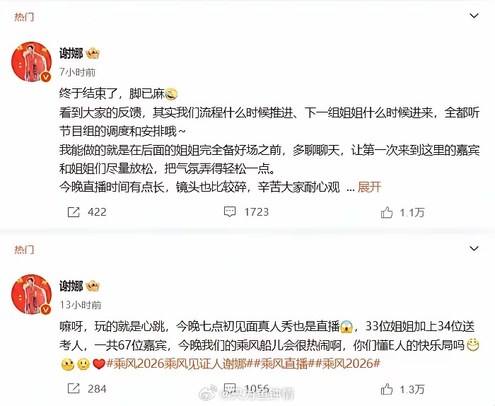 谢娜,太勇了!4月3日,谢娜深夜冲上了热搜,她没有退缩,也没有推卸责任,而是诚恳的接受了不足,也算是给自己一个台阶,给观众一个解释。到底发生了什么呢?原来,《乘风2026》直播前,谢娜就对节目大肆宣传,给节目组加油打气,使观众对各位姐姐们的出场期待满满,心里痒痒。开播前半小时,谢娜还跳出来嘚瑟了一下,想让大家守在电视机前面,准时观看他们的直播。可直播没到一半,观众们就发现剧情太拖拉,没有层次感,全都是在尬聊,甚至看的都有点瞌睡。看这个综艺,就是想看艺人和之前的变化,之间的比拼,以及小摩擦,主持人的救场,以及控场能力。但是这个直播看下来一点情绪价值都没有,全都是唠家常,没什么新鲜感。节目结束之后,谢娜连忙发文回应节奏慢,表示上台前流程都是听节目组调度和安排,上台后才是自己的主场,怕姐姐们紧张和不适应,为了营造一个轻松的氛围,所以就多聊了几句,最后造成节奏缓慢。她也直言是现场直播,也是第一次尝试,需要进步的地方还很多,相信就对了。后面还有剪辑版,让大家拭目以待。直播和剪辑版确实相差甚远,直播会记录你的一言一行,剪辑会把剧情进行调整,最后拼在一起。直播才能看出来主持人的随机演变能力,救场能力,以及她的专业能力,是对谢娜的一场大的考验,也是一个新的挑战。大家怎么看?