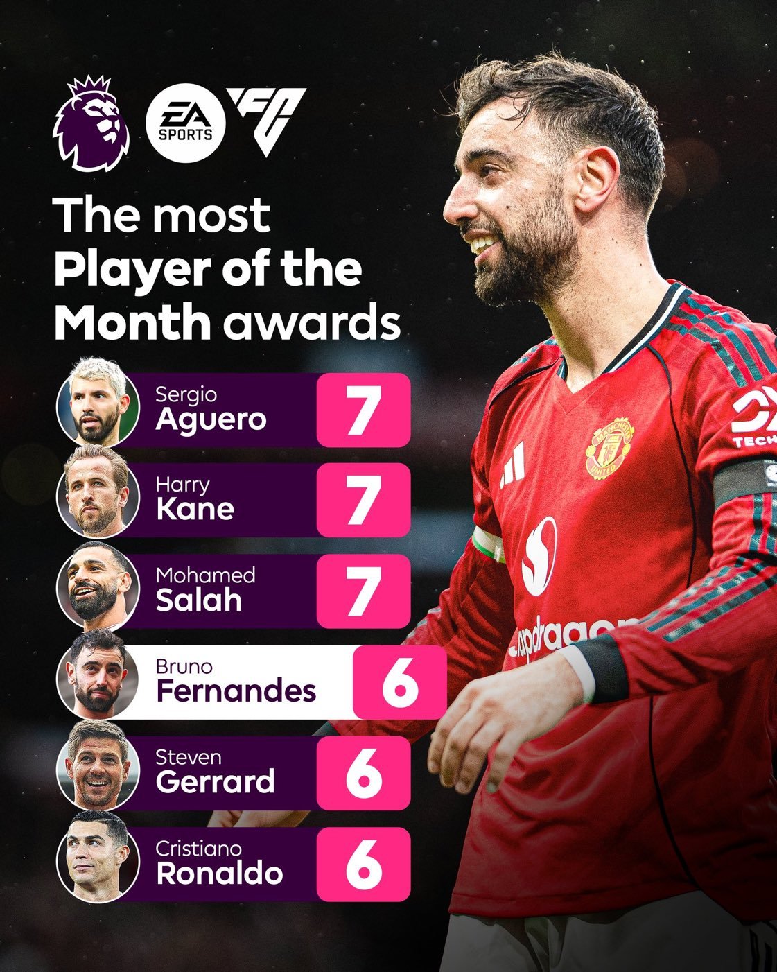 B费目前已拿到6次英超月最佳,仅次于阿奎罗,凯恩和萨拉赫(都是7次)。