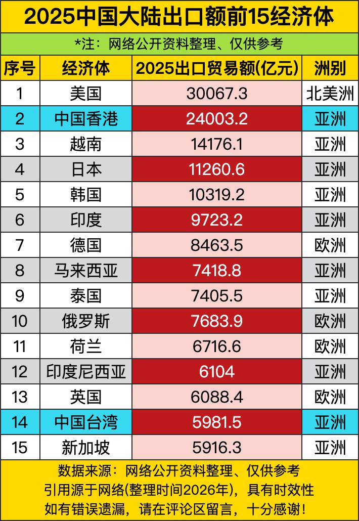美国3万亿,中国香港2.4万亿,越南1.4万亿,日本1.1万亿,韩国1万亿。中国出口,美国第一,香港第二,越南第三。美国人买中国货最多,香港人转口贸易也厉害,越南人买中国原材料加工再出口。日本韩国印度,也都是中国的大客户。中国制造,卖遍全球。 德国8463亿,马来西亚7418亿,泰国7405亿,俄罗斯7683亿,荷兰6716亿。欧洲人爱买中国货,德国人买汽车配件,荷兰人买电子产品。东南亚人爱买中国货,马来西亚买半导体,泰国买家电。俄罗斯人爱买中国货,手机、汽车、衣服,啥都买。中国制造,无处不在。 印尼6104亿,英国6088亿,台湾5981亿,新加坡5916亿。印尼人买中国机械,英国人买中国服装,台湾人买中国原料,新加坡人买中国电子。中国出口,不仅卖东西,还卖技术。中国制造,从低端到高端,啥都能造。 最惨的是那些没上榜的经济体,比如巴西、澳大利亚、加拿大,连前15都进不去。巴西人想买中国货,得找中间商。澳大利亚人想买中国货,得加价。加拿大人想买中国货,得看美国脸色。这些国家的人,不是不想买中国货,是买不起,或者买不到。这差距,比出口额还大。