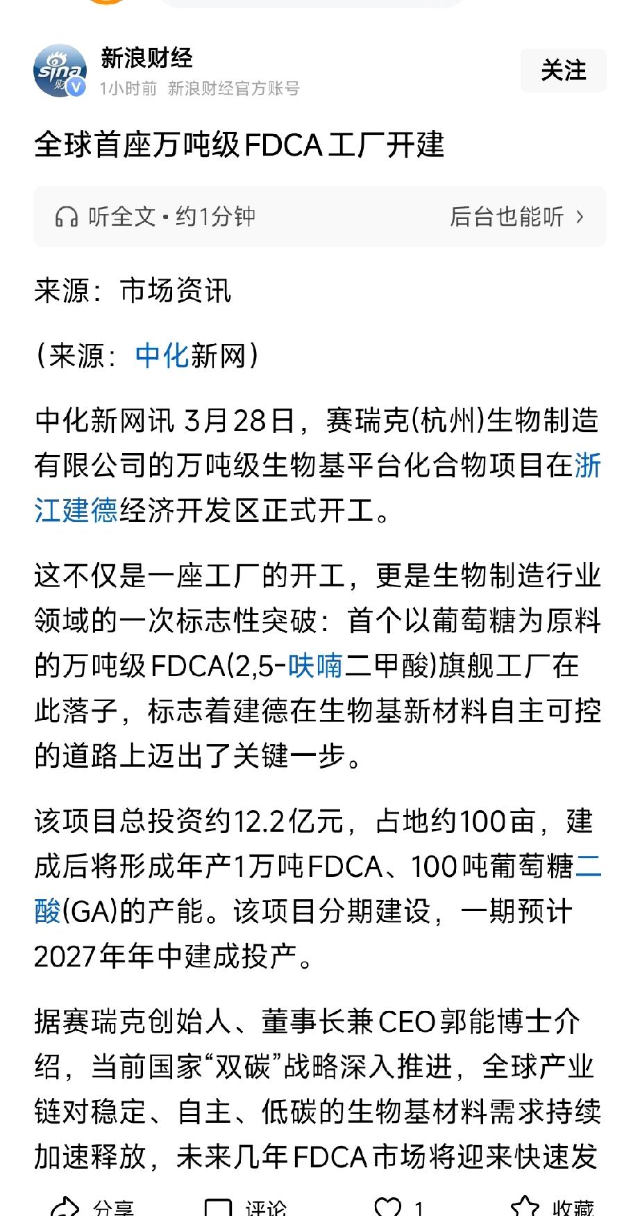 全球首座万吨级FDCA工厂开建!生物基材料替代石油化工,万亿赛道爆发 全球首个以葡萄糖为原料的万吨级FDCA工厂在浙江建德开工,总投资12.2亿,2027年投产。FDCA是PTA绿色替代品,可制生物基聚酯、尼龙、聚氨酯,契合双碳战略。石油替代+自主可控双逻辑,生物基新材料进入规模化元年,产业链全面受益。 核心标的(6只) 1. 凯赛生物(688065):生物基聚酰胺龙头,技术同源,最受益FDCA产业化 2. 金发科技(600143):改性塑料+生物基材料龙头,布局生物基聚酯下游 3. 中粮科技(000930):葡萄糖原料龙头,FDCA上游核心供应商 4. 华恒生物(688639):生物基化学品龙头,技术平台共享,协同性强 5. 金丹科技(300829):生物基乳酸龙头,延伸生物基材料产业链 6. 瑞丰高材(300243):生物基可降解材料核心,适配FDCA下游应用