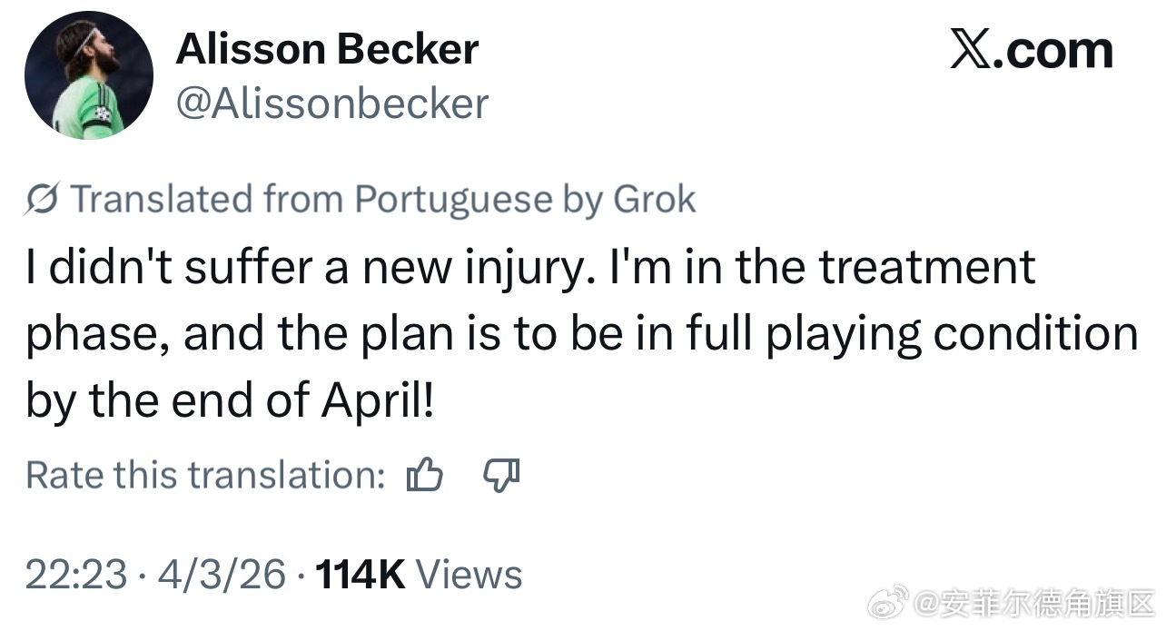 阿利森社媒亲自辟谣,没有新的伤病出现目前就是处在一个治疗阶段,自己的计划是在四月底复出。辟谣罗哥前面说的五月份之前复出不了