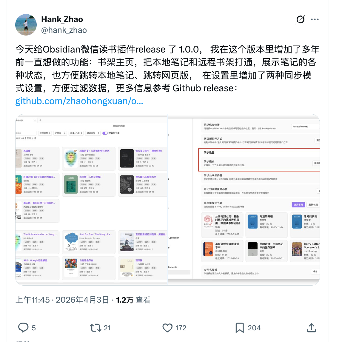 github:github.com/zhaohongxuan/obsidian-weread-plugin