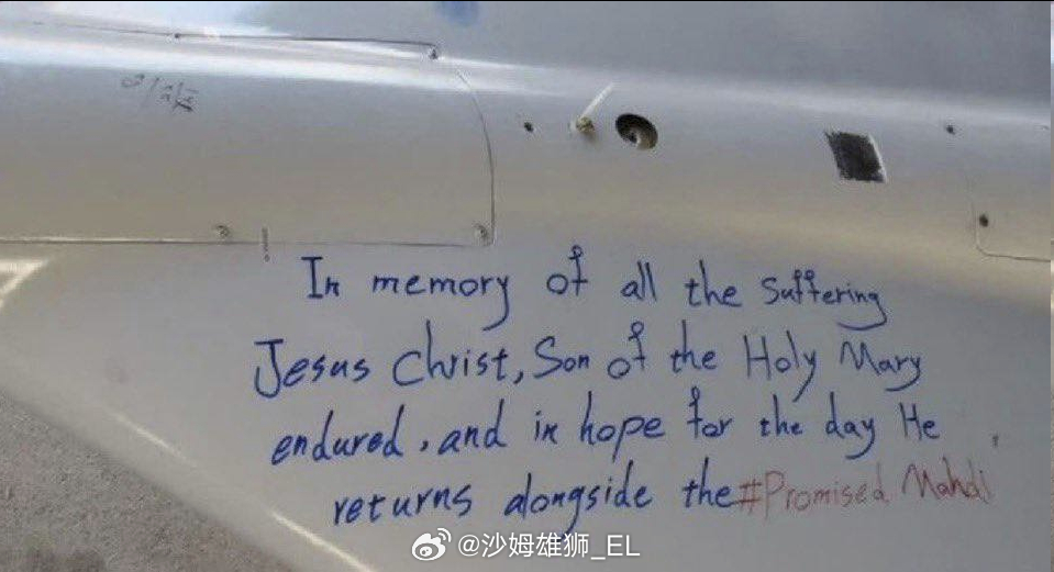 伊朗人在耶稣受难日发射自杀式无人机时写下的文字:“谨以此纪念耶稣基督——圣母玛利亚之子——所承受的一切苦难。”