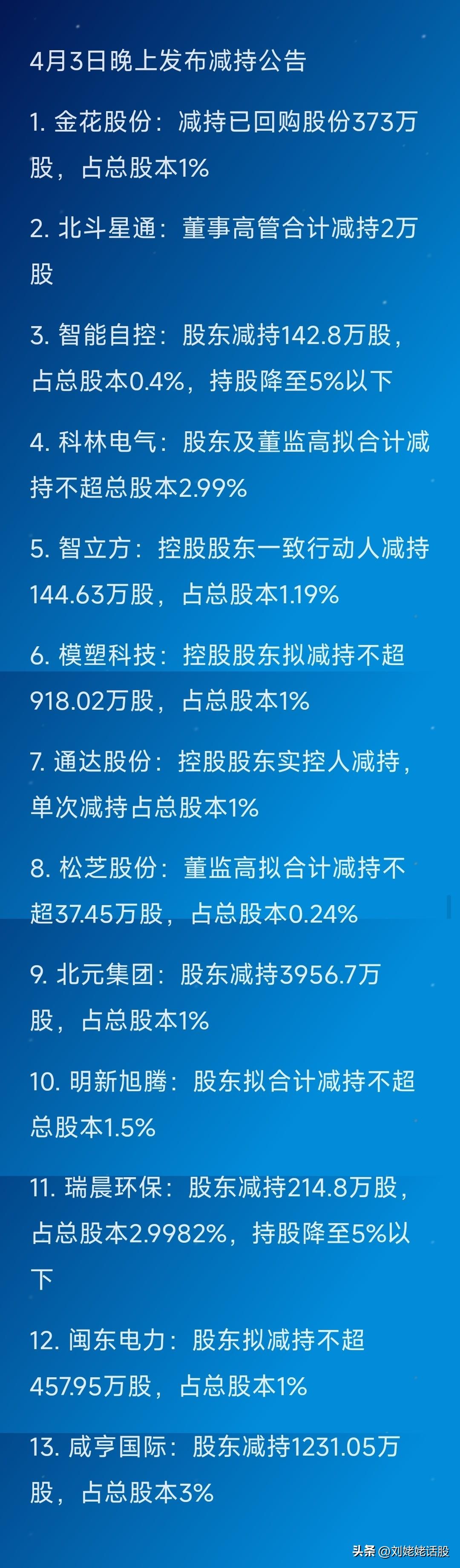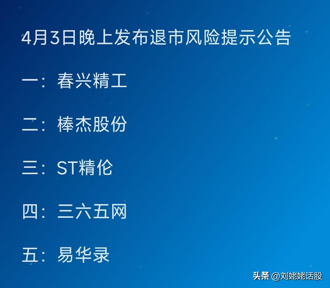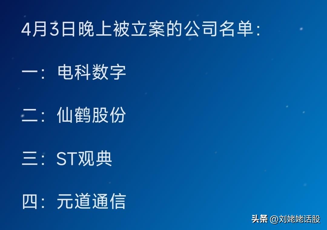 周末(清明节)股市利空来袭…… 【一】公告“被立案”的公司达到了四家:分别是 一:电科数字 二:仙鹤股份 三:ST观典 四:元道通信 【二】公告发布退市风险提示公告的公司达到了五家: 一:春兴精工 二:棒杰股份 三:ST精伦 四:三六五网 五:易华录 【三】发布减持公告的公司达到了将近二十家…… 具体详见下图! 关注“刘姥姥”,精彩分享真不少(麻烦亲们:点赞,收藏,分享)。 特别提醒:本文涉及内容及个股,仅供交流与参考,不是荐股,不得以此作为买卖依据,盈亏自负。立案调查股票
