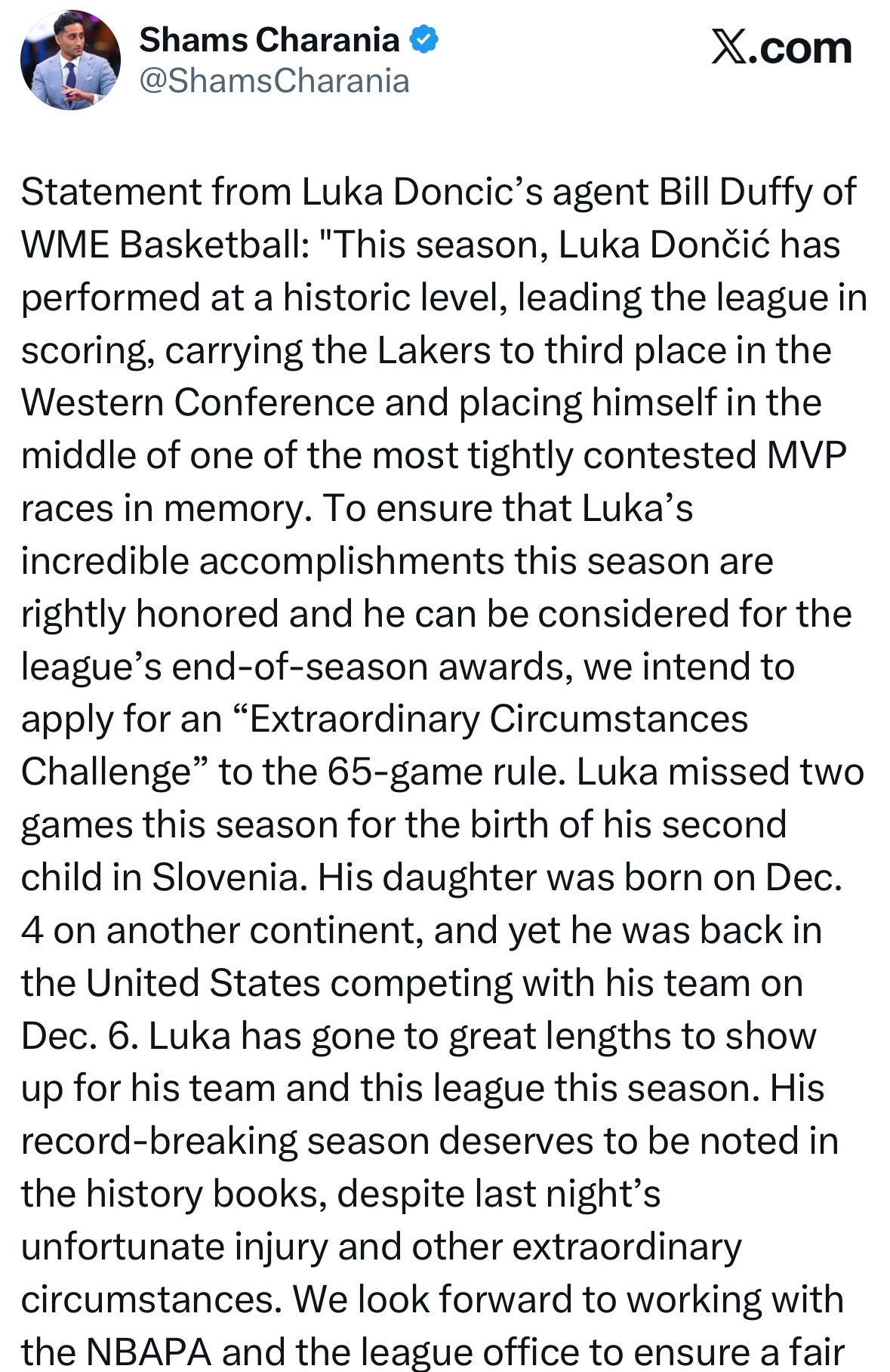 卢卡本赛季为球队和联盟付出了巨大努力。尽管昨晚遭遇了不幸的伤病,以及其他特殊情况,但他这个破纪录的赛季理应被载入史册。我们期待与NBA球员工会以及联盟办公室合作,确保此事得到公平的结果。