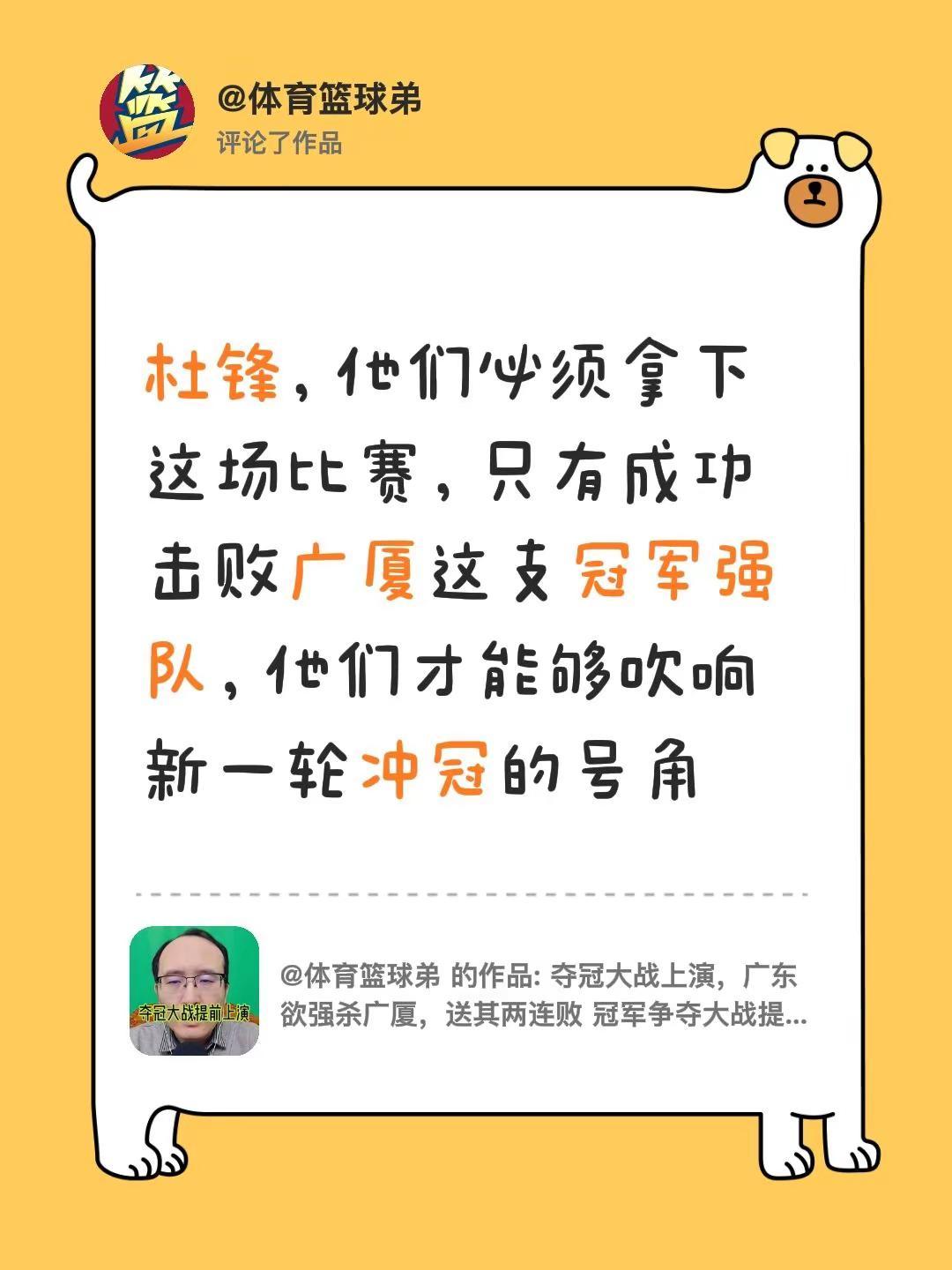 我评论了@体育篮球弟 的作品:杜锋,他们必须拿下这场比赛,只有成功击败广厦这支冠军强队,他们才能够吹响新一轮冲冠的号角