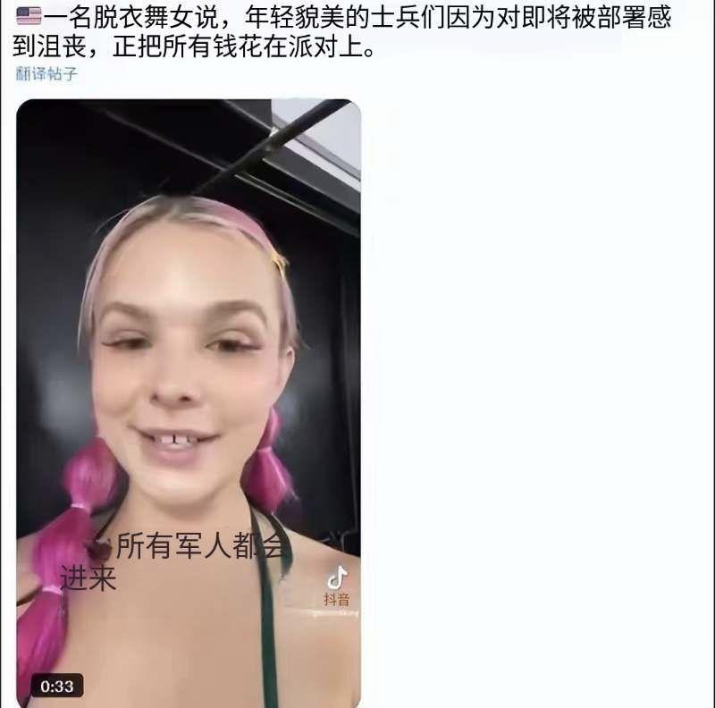 美军士兵上战场前夜到风月场酗酒嫖娼! 按照美国军事题材的电影显示,美军士兵走上战场前士气高昂,在战场上所向无敌。实际上呢,有不少美军士兵临上战场前走进温柔乡,酗酒嫖娼,千金买醉。 网上流传一段视频,一位艺名叫Charm Daze的脱衣舞女说,在被派往伊朗前线的前夜,美国大兵争先恐后的涌入当地的风月场所,强颜欢笑,挥金如土,一夜之间花光全部积蓄,用最后的狂欢麻痹自己,因为他们早已被死亡阴影笼罩,他们很是绝望。她说,投入战场前“所有的士兵都会进来”(如图)。 我们说,一支军队有了信仰,士兵知道正义而战,这样的部队才能战无不胜。而美国发起的战争是对一个主权国家的侵略,是对无辜平民的滥杀,他们的士兵有很强烈的厌战情绪。面对入侵国家的同仇敌忾,他们不知道是死是活,所以,只能用酒精、大嘛和女人的身体作践自己。这样的军队又怎么可能无往而不胜呢?