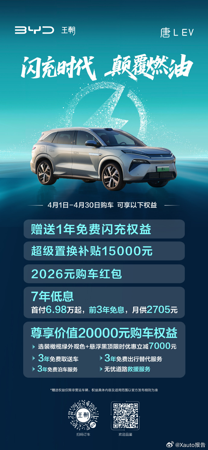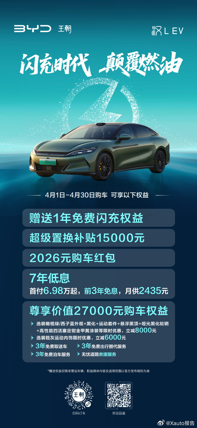 比亚迪四月购车福利来袭!4月全月,汉L EV、唐L EV享闪充、低息及高额置换补贴;秦L DM-i补贴后8.98万起,可选零息金融方案,首付门槛低,油转电购车超划算。工业奇迹秦L限时补贴价8.98万元起比亚迪秦ldm-i比亚迪汉lev唐lev