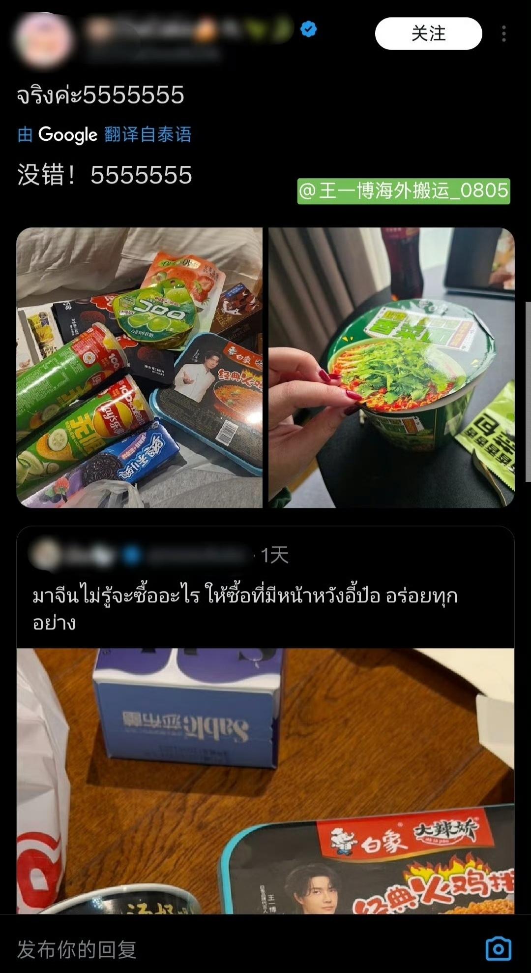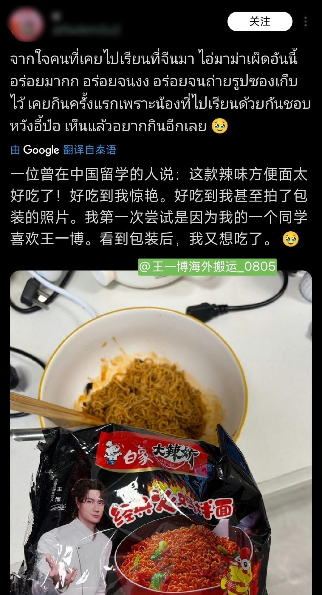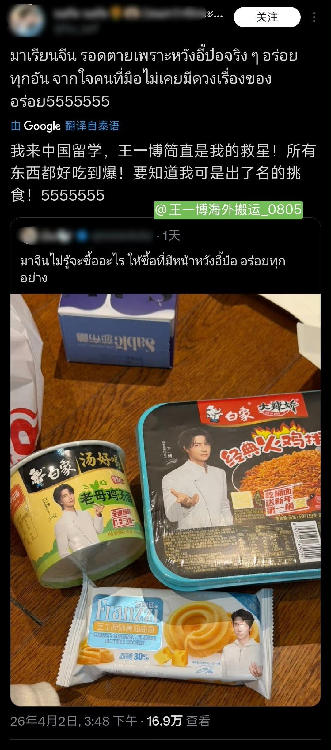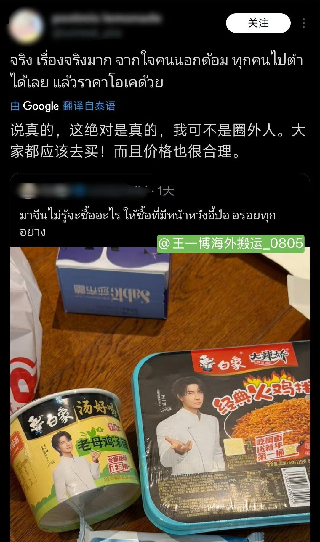 哈哈哈哈哈,王一博在他泰,不但是人人皆知的大明星,还是“品质保证”[捂脸]。 王一博=品质保证=美味认证[笑哭] 原帖博主强烈安利:“如果你在中国不知道买什么,那就买任何印有王一博头像的东西,每一样都很好吃!” ,引起广泛共鸣。 王一博是真的火,实火。