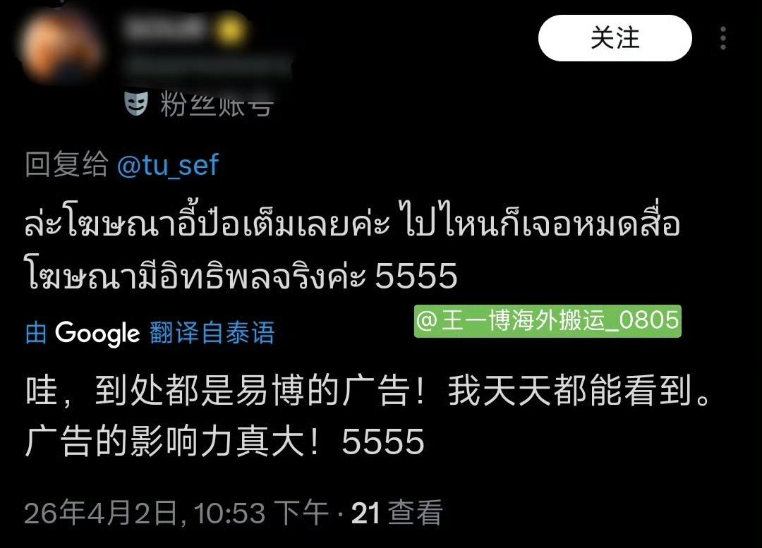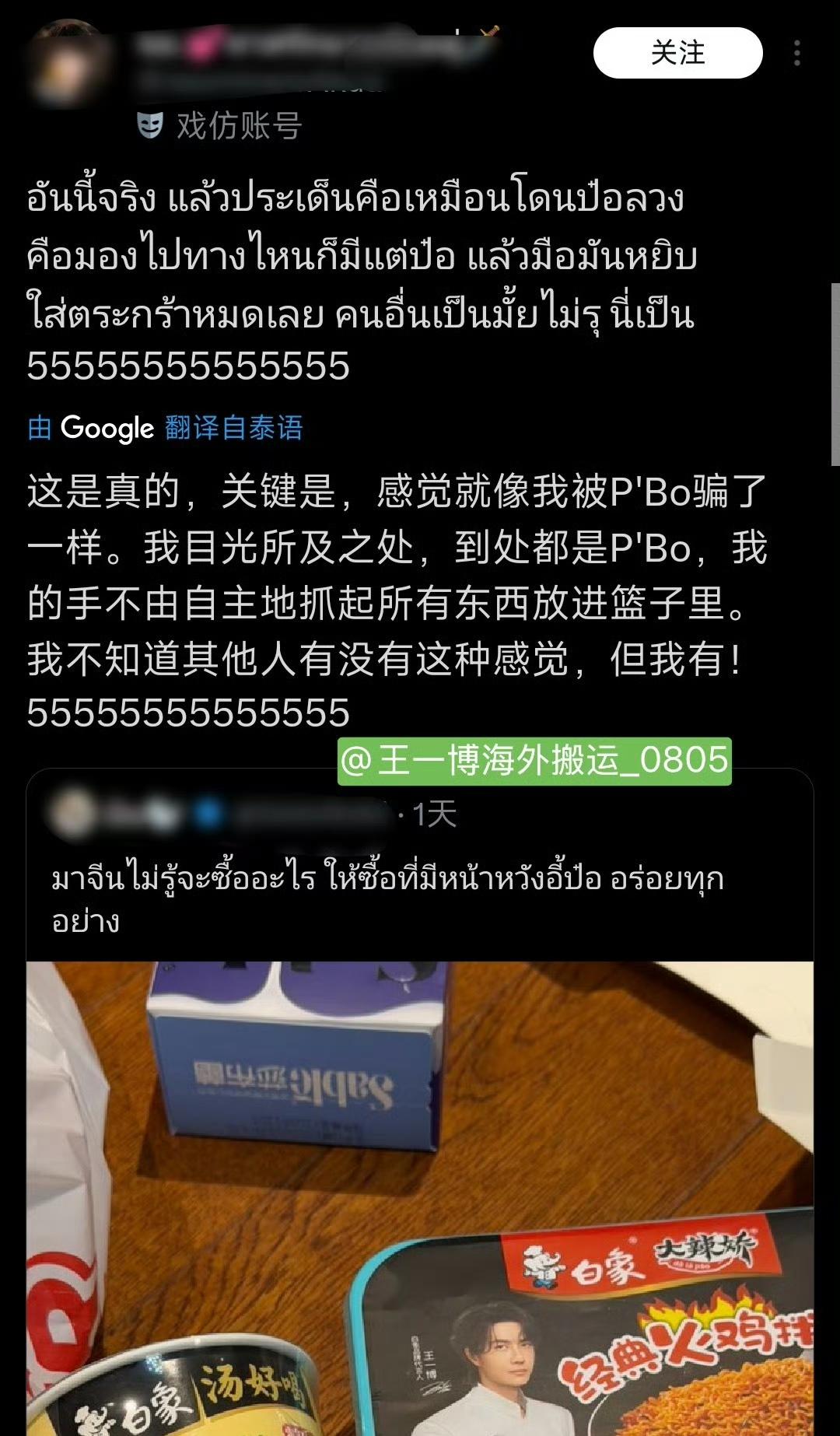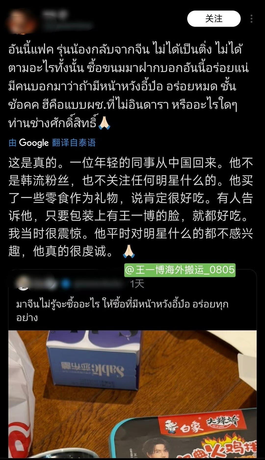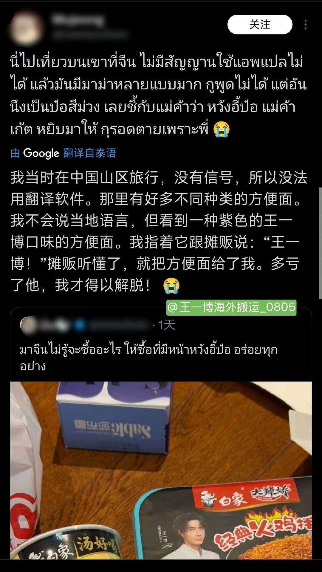 哈哈哈哈哈,王一博在他泰,不但是人人皆知的大明星,还是“品质保证”[捂脸]。 王一博=品质保证=美味认证[笑哭] 原帖博主强烈安利:“如果你在中国不知道买什么,那就买任何印有王一博头像的东西,每一样都很好吃!” ,引起广泛共鸣。 王一博是真的火,实火。