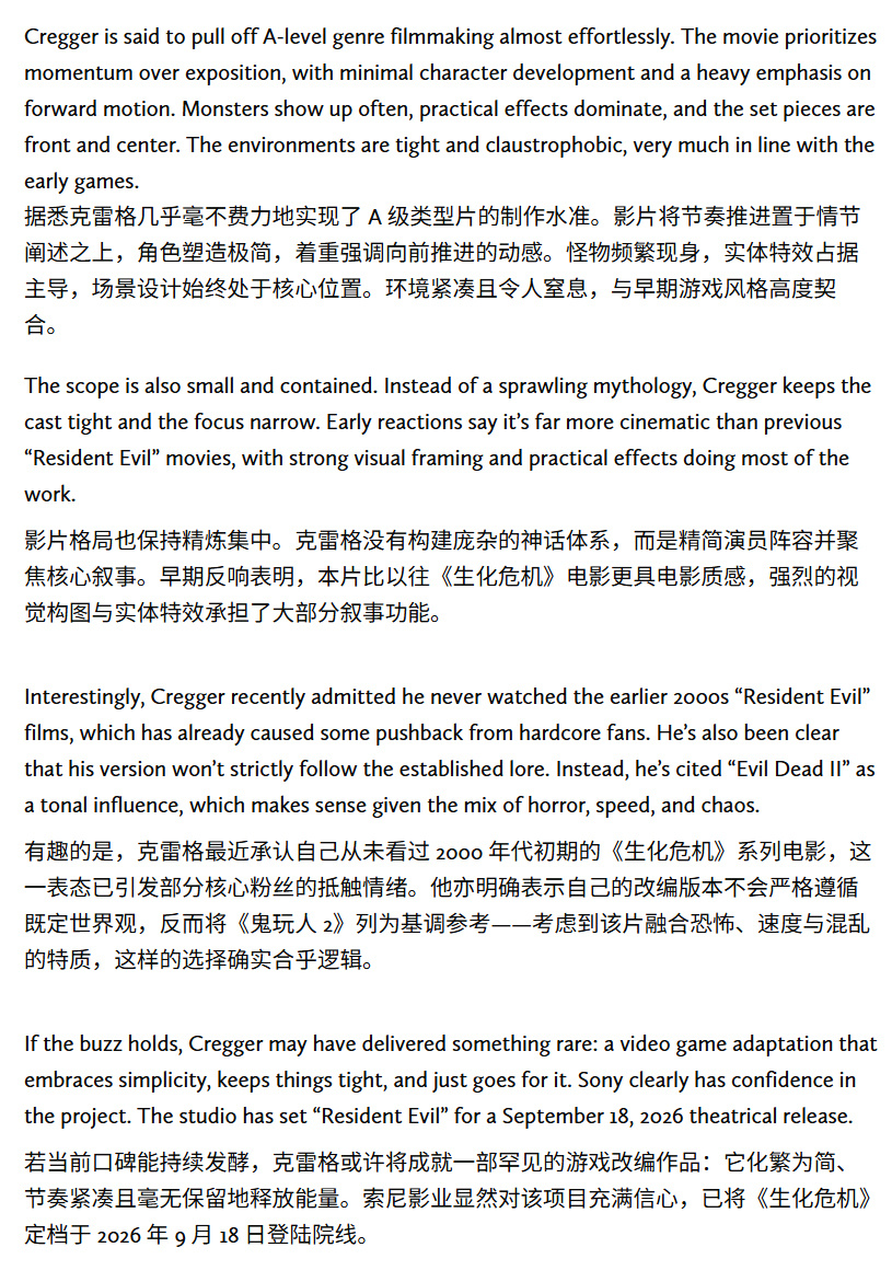 【传言】扎克·克雷格(《野蛮人》《凶器》)版的《生化危机》试映反响热烈。90分钟重启版被形容为恐怖片版本的《疯狂的麦克斯》。