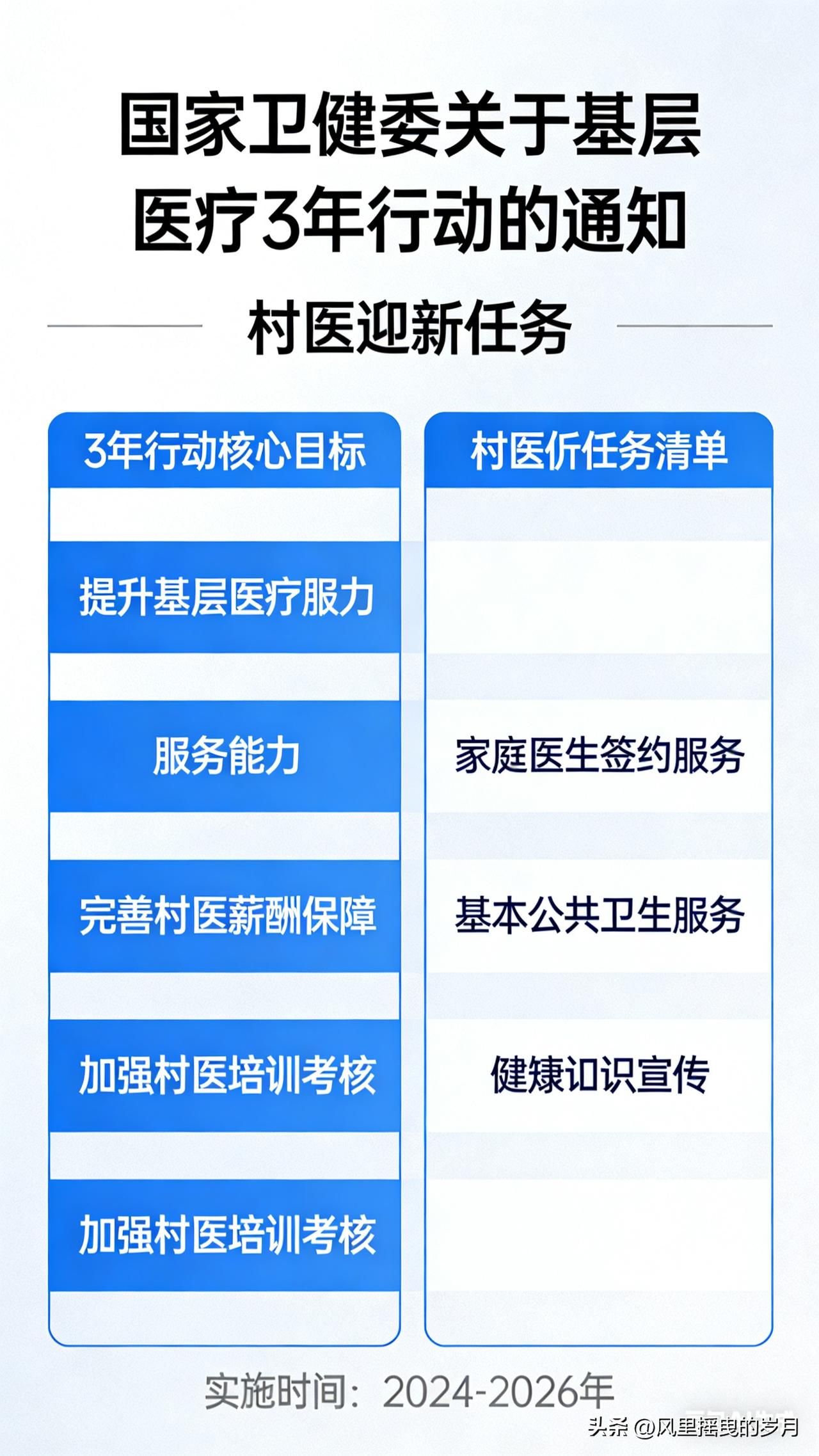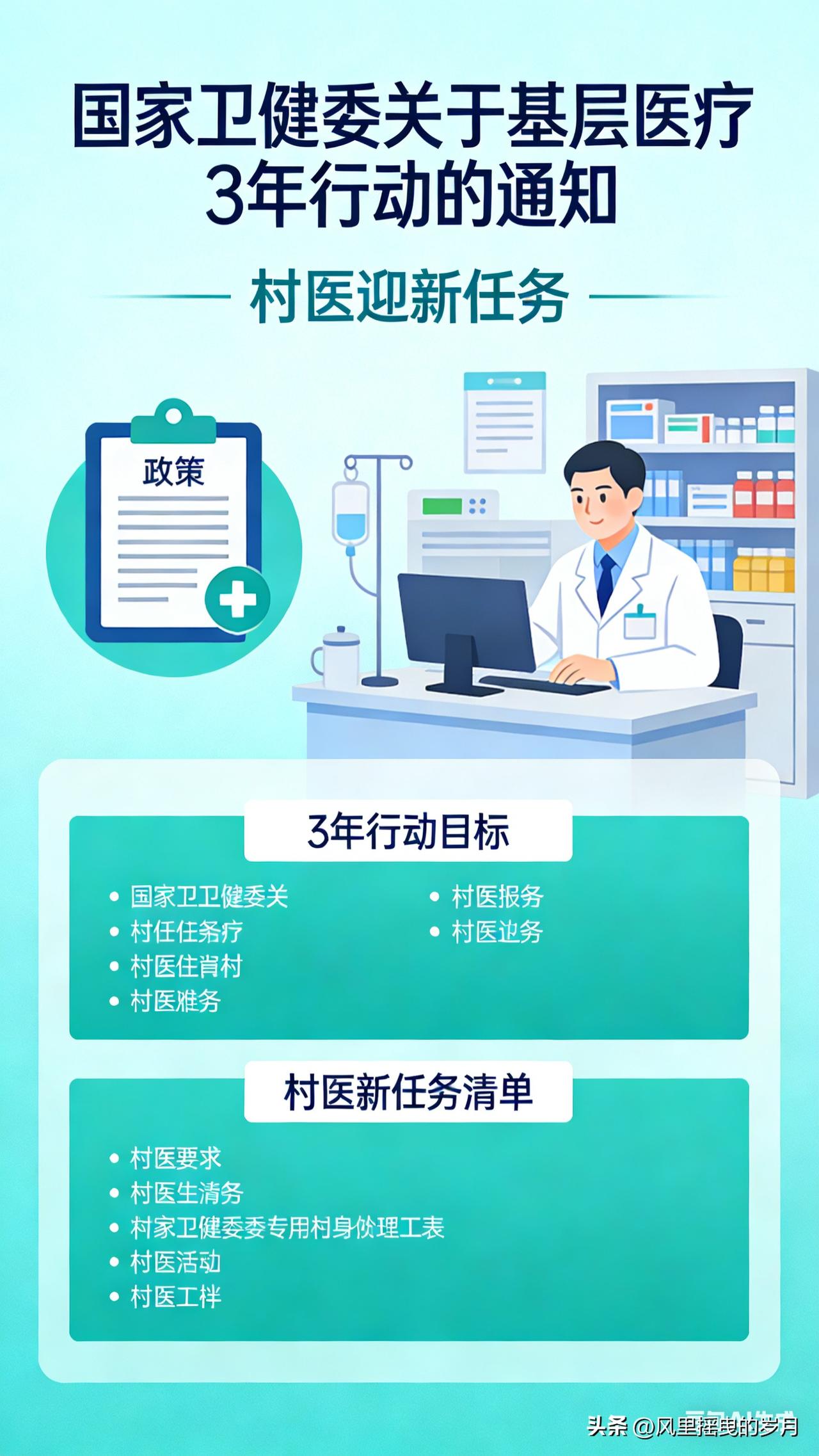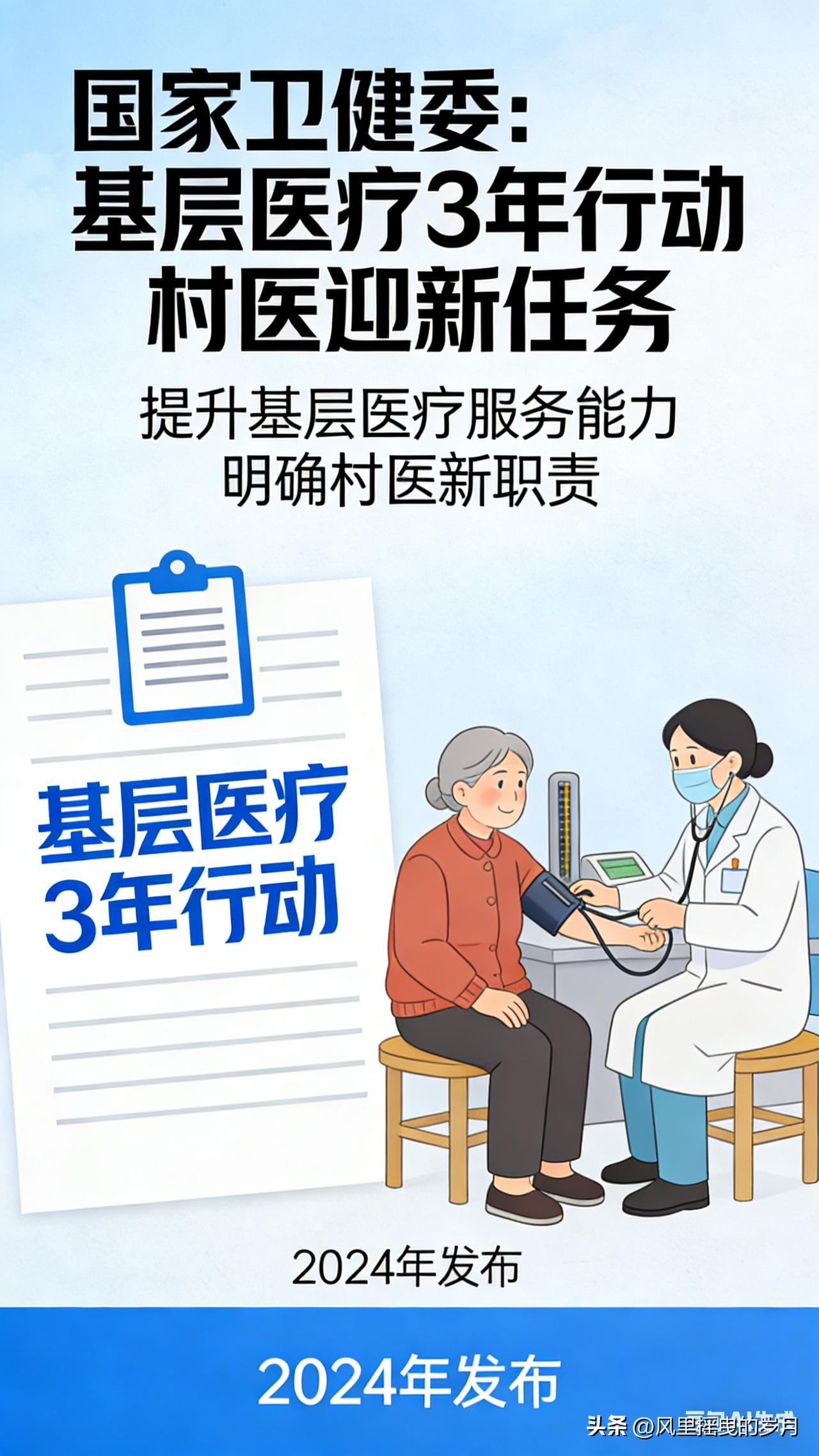 国家卫健委发文!基层医疗3年行动启动,村医迎五大新任务(2026—2028) 2026年4月1日,国家卫健委、国家中医药局联合发布《基层医疗卫生机构医疗质量改善三年行动(2026—2028年)》,明确未来三年基层医疗质量全面提档,全国近百万村医正式纳入国家统一质控体系,迎来执业规范、服务能力、监管模式的全方位变革。 一、政策核心:村医告别“松散管理”,3年纳入全国质控 此次行动是建国以来首次将村医、村卫生室全面纳入与公立医院同级的医疗质量管理体系,彻底解决基层“末端薄弱、监管空白”问题。 三年刚性时间表 - 2026年底:覆盖中心乡镇卫生院、30张床以上社区卫生服务中心 - 2027年底:扩展至所有乡镇卫生院、社区卫生服务中心 - 2028年底:全面覆盖村卫生室、社区服务站,全国基层质控体系建成 监管模式:以紧密型县域医共体为单位,县级医院、乡镇卫生院直接“盯管”村医,诊疗、处方、用药全流程上系统、受监管。 二、村医五大核心新任务(2026—2028) 1. 处方用药全规范,安全成硬杠 - 必须按安全、有效、经济、适宜原则开具处方,禁止经验用药、大处方、超范围用药 - 落实处方审核、点评制度,不合格处方整改、违规追责 - 强化抗菌药物分级管理、特殊药品管控,做好药品不良反应监测 - 保障老人、儿童、慢性病患者用药安全,规范长期处方 2. 诊疗服务标准化,首诊与质控压实 - 严格执行首诊负责制,按基层指南、规范、路径看病,做到合理检查、合理治疗 - 门诊病历、处方、健康档案书写全规范、全电子化,提升医疗文书质量 - 家庭医生签约服务提质:上门评估、随访、健康指导、家庭病床全流程质控 3. 急诊急救能力大提升,筑牢第一道防线 - 加强急危重症早期识别、初步处置、安全转诊能力 - 配齐急救药品与设备,强化与县级医院急诊衔接 - 掌握常见急症(胸痛、卒中、创伤、过敏、休克)基层急救流程 4. 全员培训考核,能力三年大升级 - 3年内完成全覆盖轮训:诊疗规范、合理用药、中医适宜技术、急诊急救、检验检查解读、院感防控 - 培训与执业、收入、考核直接挂钩,不合格者暂停执业、限期补考 - 县级医院医师下沉带教、巡诊,一对一帮扶村医提升技能 5. 医共体一体化管理,责任与保障同步强化 - 村卫生室纳入乡村一体化:人员、业务、药械、财务、绩效统一管理 - 医疗质量定期自查、上级督查、年度评估,结果与补助、绩效、续聘挂钩 - 同步推进收入与养老保障:公卫补助向村级倾斜、偏远地区补助提高、养老保险全覆盖 三、对村医的影响:挑战与机遇并存 - 挑战:执业更规范、监管更严格、能力要求更高,不达标将面临整改、停岗甚至退出 - 机遇: - 身份更规范:从“松散个体”变为国家质控体系一员,职业认可度提升 - 能力有保障:免费培训、上级带教、设备更新、远程医疗支持 - 待遇更稳定:补助、绩效、养老同步加强,收入与质量、工作量挂钩 - 发展有通道:符合条件可评中高级职称、向乡镇/县级医院流动 四、基层医疗新格局:分级诊疗“基层首诊”加速落地 三年行动后,基层医疗将实现质量标准化、服务同质化、监管全覆盖,村医从“看病开药”转向“健康守门人+质量安全责任人”。 对村民而言:在家门口就能享受更安全、更规范、更放心的医疗服务,小病不出村、慢病能管好、急症快识别转诊,基层就医信任度大幅提升。 结语 2026—2028年,是村医职业转型的关键三年。从“粗放行医”到“规范质控”,从“个体执业”到“体系管理”,既是压力更是机遇。主动适应、提升能力,才能在基层医疗高质量发展中站稳脚跟,成为百姓信赖的健康守护者。