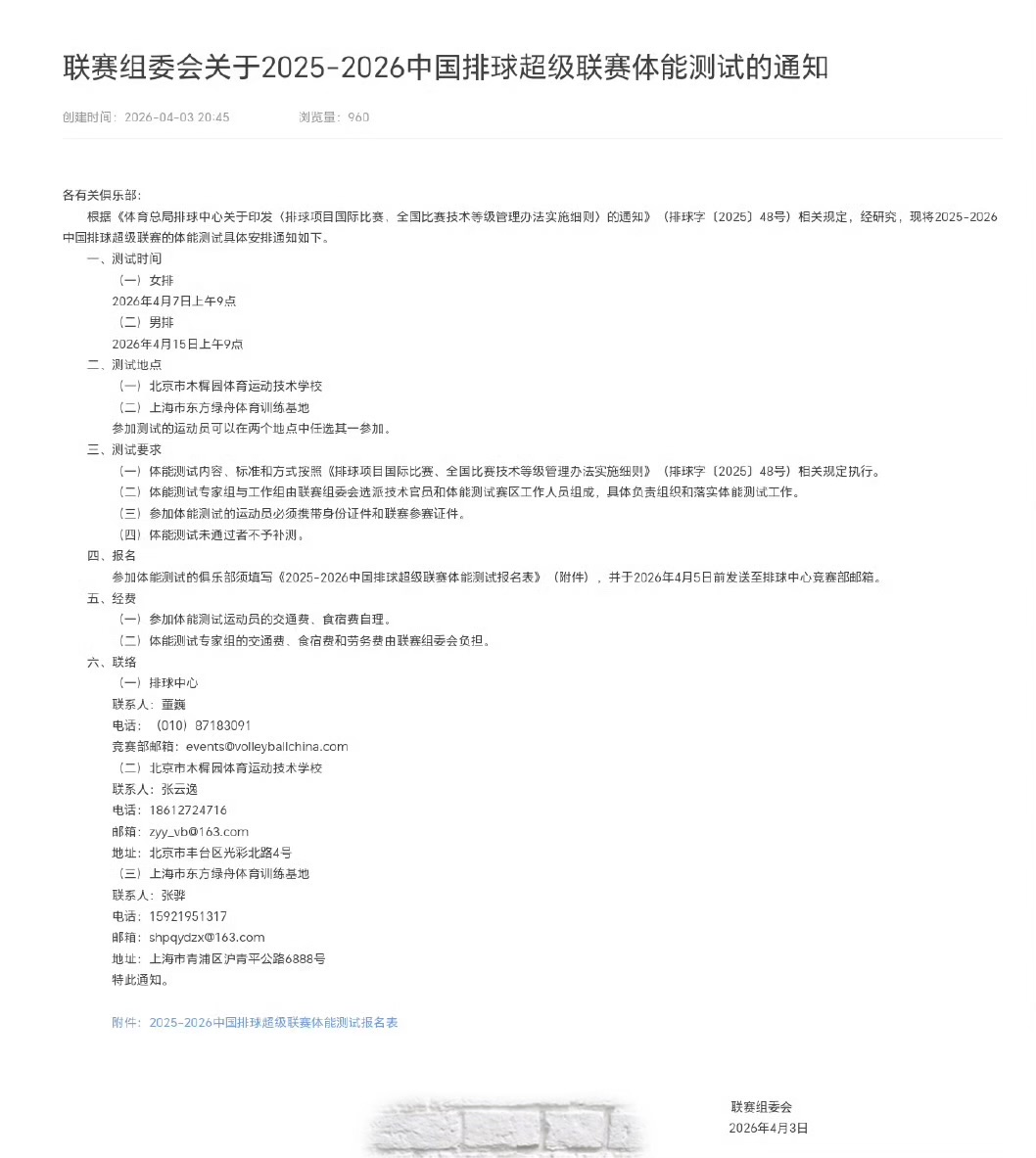 女排联赛刚打完还搞体能测试?球员还负担交通费和食宿费? 4月3日晚,联赛组委会发布消息,经研究,通知各俱乐部要安排体能测试。女排联赛都打完了竟然还搞体能测试?参加测试的球员还要交通费和食宿费自理?球迷很好奇,是否应该是国家队集训名单球员报到后的测试却没有修改俱乐部相关的抬头和内容呢,所以,如果真是这样的低级错误,那么某协、国家队的相关工作人员的职业态度就可见一斑!