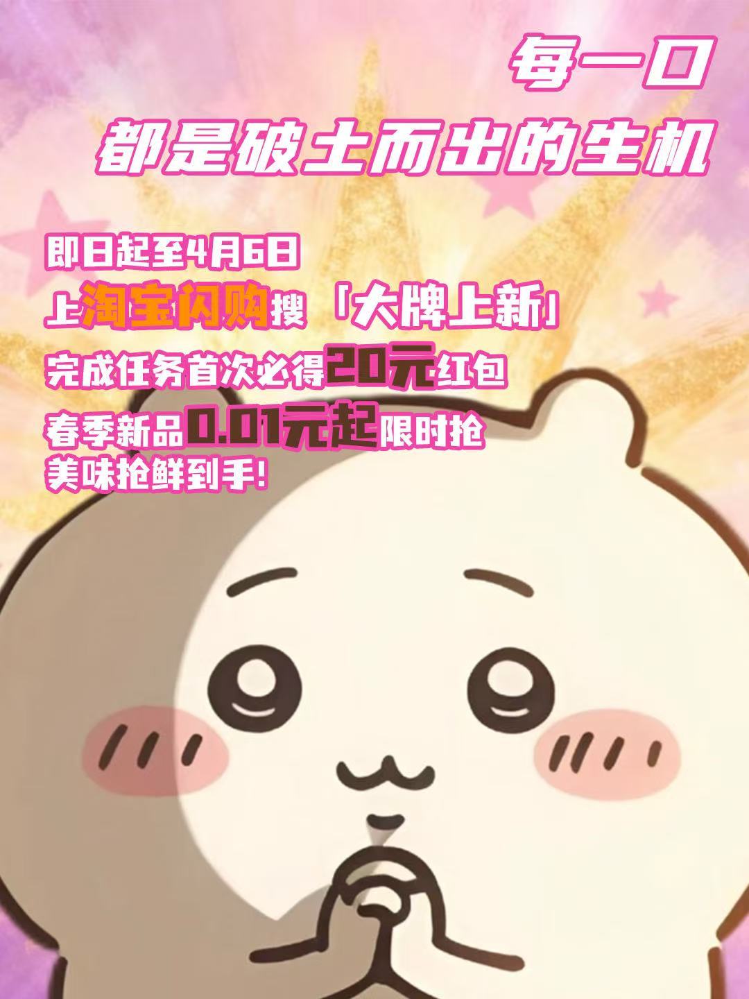 呼叫所有“现”女友!的春日限定福利来啦~上淘宝闪购搜「大牌上新」✅完成任务首次必得20元红包(哥哥给的零花钱!)⏰0.01元春季新品限时抢,花一毛钱吃春天~🕘追星女孩的抢购时刻表📝9:00-11:00 0.01元春季新品+春季限定香片11:00-14:00 0.01元春季新品+春季限定香片14:00-18:00 0.01元春季新品+卡皮巴拉联名公仔18:00-21:00 0.01元春季新品+9.9元春菜/特色菜/地方菜21:00-24:00 9.9元春菜/特色菜/地方菜+卡皮巴拉联名公仔 冲就完事了,哥哥的“鲜”气我先接住!淘宝闪购李现邀你抢春天第一口鲜淘宝闪购大牌上新季淘宝闪购