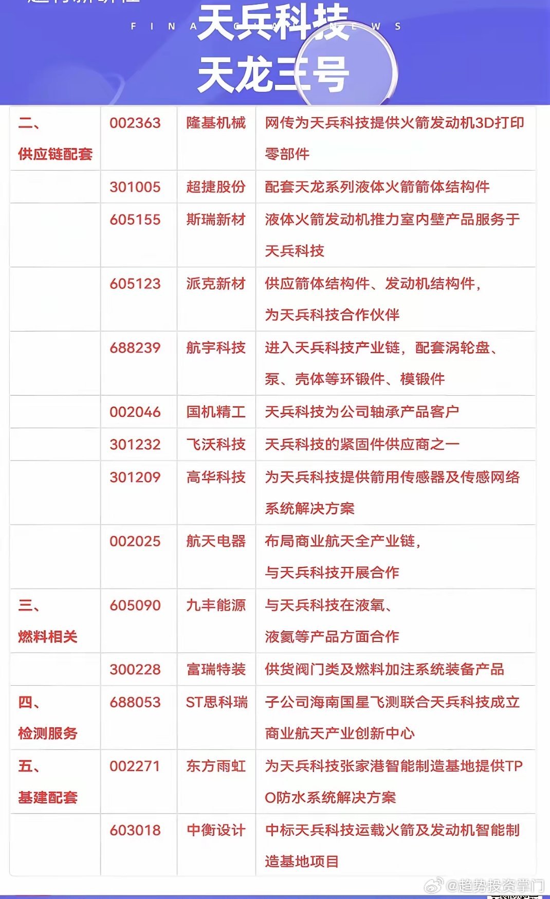 天兵科技天龙三号今日首飞,国产商业航天迎里程碑。这款"中国版猎鹰9号"近地轨道运力17-22吨,直接对标SpaceX。从参股、燃料、基建到全产业链,多家A股公司深度配套,助力中国航天加速崛起。