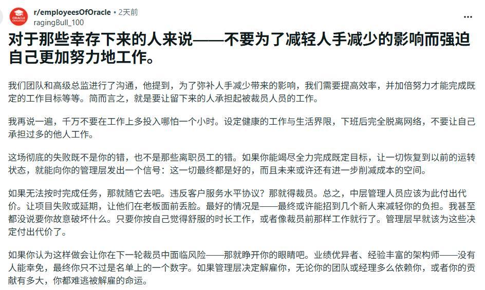 硬刚到底!甲骨文员工集体对抗裁员:有人删资料,有的拒绝加班 3月31号那天,全球大概2到3万名甲骨文员工一睁眼,邮箱里躺着封冷冰冰的邮件,没预警、没面谈、没交接,直接一句话:你被裁了,今天就是最后一天班。 邮件发出的同时,员工的系统权限、门禁卡全被锁死,想收拾个人东西、交接工作都没门,这操作被网友骂成“科技大厂最绝情裁员”。 当时很多人以为就是普通优化,可一扒背景,全是火气——甲骨文上季度净利润直接暴涨95%,狂赚61.3亿美元,根本不缺业绩。 裁员的真实目的,是为了凑80到100亿美元现金流,全砸进和OpenAI合作的“星际之门”AI数据中心项目,整个项目要投上千亿,说白了就是牺牲几万员工,给公司豪赌AI赛道凑本钱。 这事一曝光,全网都在骂甲骨文吃相难看,可更没想到的还在后面。 被裁的人走了,留下的员工没忍气吞声,反而搞了场史无前例的无声反抗。不知道谁先起的头,内部很快达成共识:公司裁员省的钱,造成的人手缺口自己买单,我们一分钟额外班都不加。这个倡议在内部瞬间爆火,超10万员工点赞,几乎全员响应。 大家说干就干,有人卸载手机上的工作邮箱,下班就彻底失联,领导的电话、消息一概不回;有人到点准点拎包走人,多待一秒都不愿意; 还有人死死守住本职边界,被裁同事留下的活、堆积的任务,一概不接,哪怕项目延期、客户催单,也绝不替公司填坑。 更激烈的对抗也没少。有些被裁员工心里憋屈,离开时直接删掉了自己负责的项目资料、代码和运维文档,不是搞破坏,就是想让公司知道,随意踢人是要付出代价的。还有人在社交平台号召大家做空甲骨文股票,想用资本的方式反击资本的冷漠。 管理层那边更离谱,裁员第二天就开会,要求留任员工“提高人效,一个人干两个人的活”,这话一出,彻底把员工惹毛,本来还有点犹豫的人,也全都站到了对抗这边。 现在这事还在发酵,项目延期、客户投诉越来越多,甲骨文的运营节奏全乱了。公司想施压、想谈条件,可员工们态度坚决,就是不松口,摆明了要硬刚到底。 外界看着热闹,其实这事戳中了所有打工人的痛点——公司赚得盆满钵满,转头就用最绝情的方式裁人,把成本全转嫁给留下的员工,换谁都忍不了。 员工们拒绝加班、不接额外活、甚至删资料,不是胡闹,是在守住自己的底线,告诉资本:打工人不是可以随意压榨的工具。 这事到最后谁赢谁输还不好说,但至少让大家看到,面对不公的裁员和压榨,打工人团结起来硬刚,真的能让资本有所顾忌。 甲骨文想靠牺牲员工赌AI未来,可现在看来,这场由裁员引发的对抗,怕是要让它付出比裁员省下的钱,大得多的代价。
