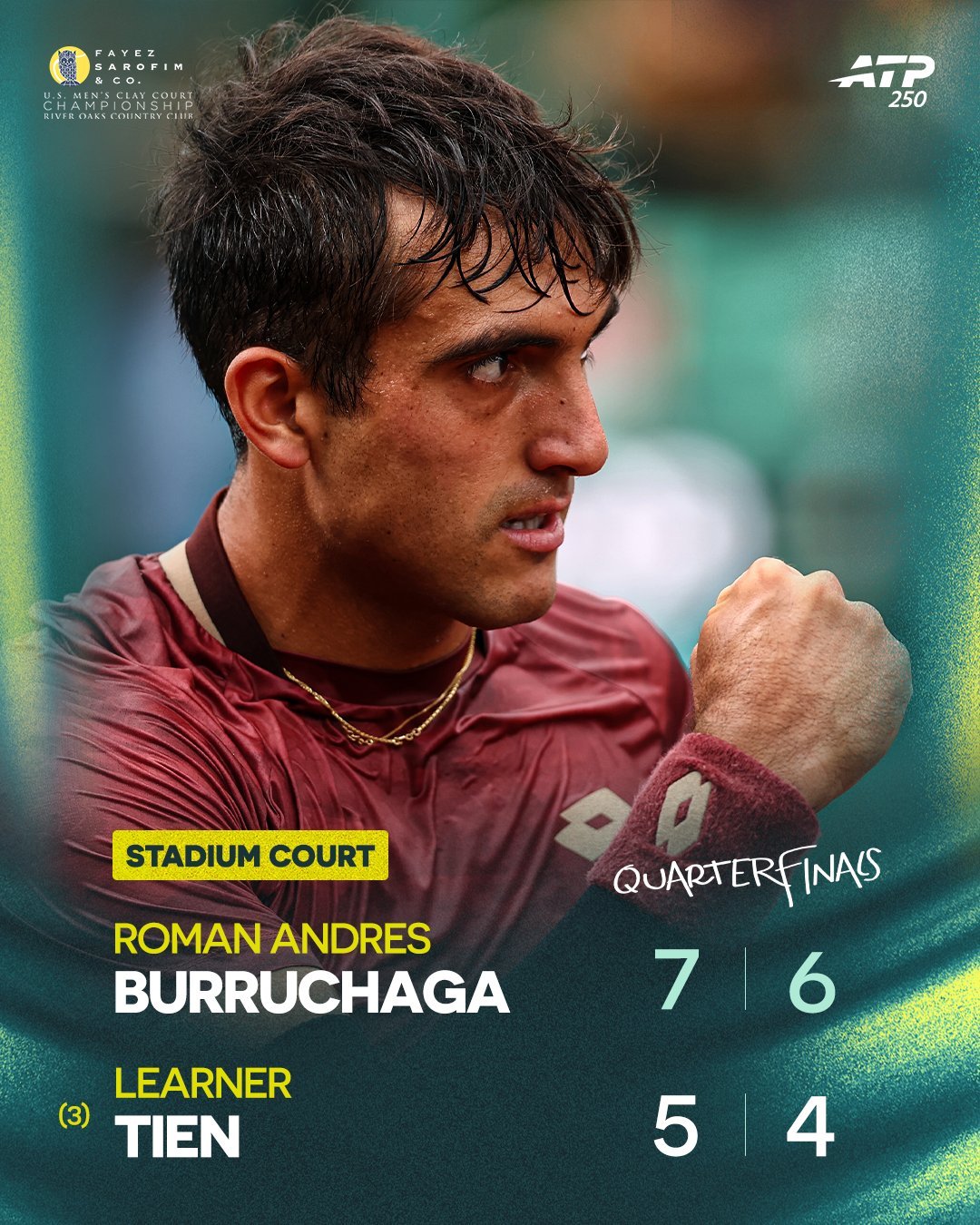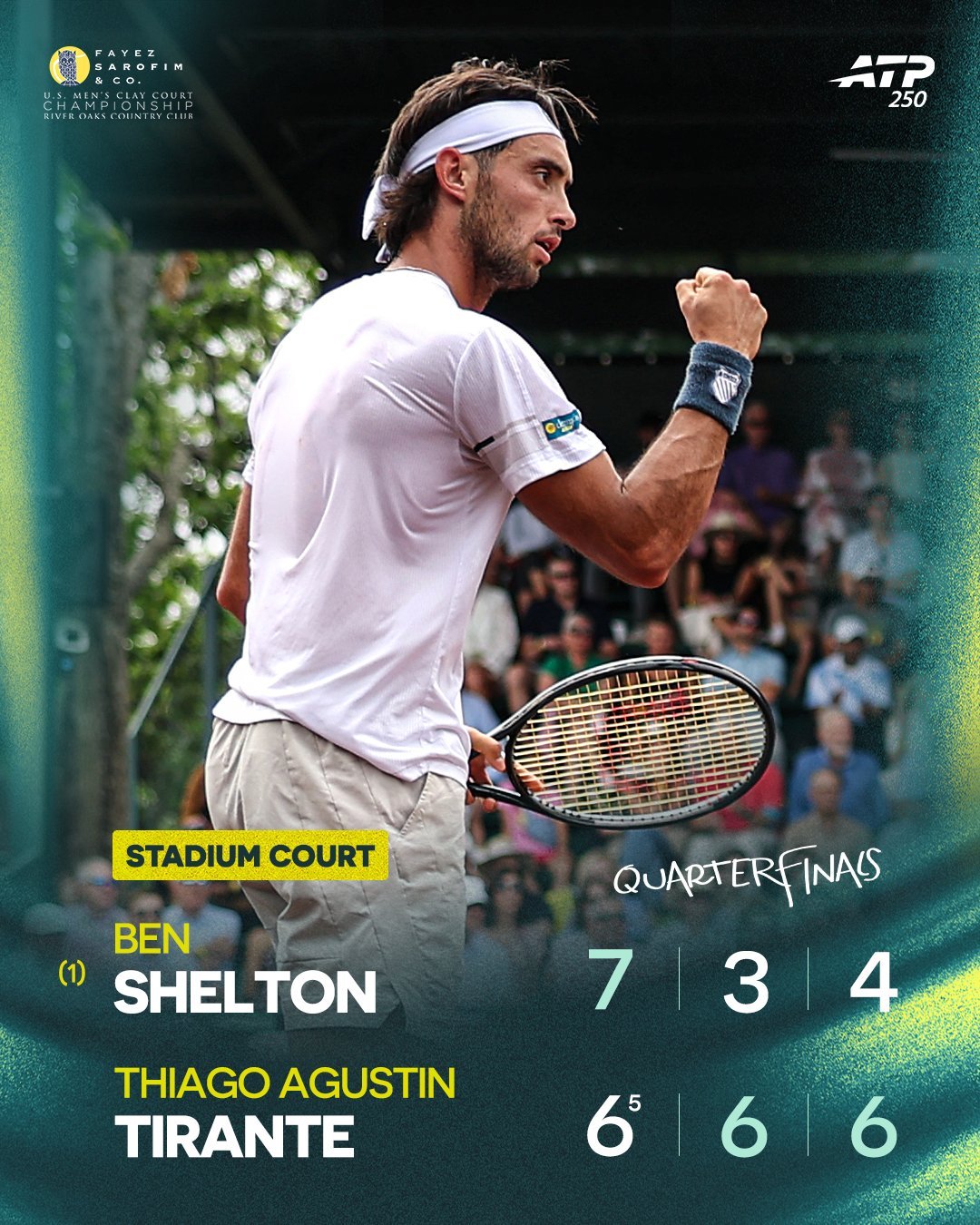 ATP250休斯顿红土赛:上半区:头号种子谢尔顿7-6/3-6/4-6惨遭蒂兰特逆转,无缘四强。3号种子勒纳·钱5-7/4-6不敌布鲁查加,同样止步。两位阿根廷人争夺决赛席位。下半区,4号种子保罗6-4/6-2击败6号种子埃切维里,2号种子蒂亚福3-6/6-4/7-6逆转波佩林。两位美国本土选手争夺决赛权。