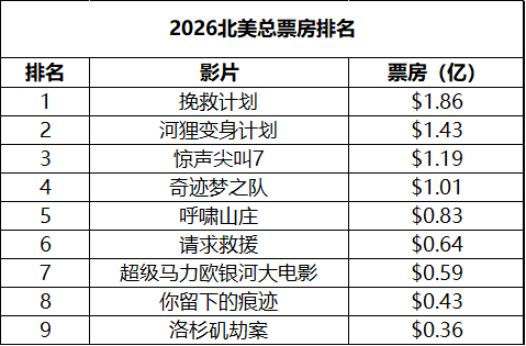 2026年第13周北美票房 :1.《挽救计划》蝉联冠军,累计票房1.86亿暂居年度第一,全球累计票房3.39亿排名年度第2;2.《超级马力欧银河大电影》开画2天成绩出色,主题乐园又赢了;3.《河狸变身计划》全球累计票房破3亿。(数据:boxofficemojo)