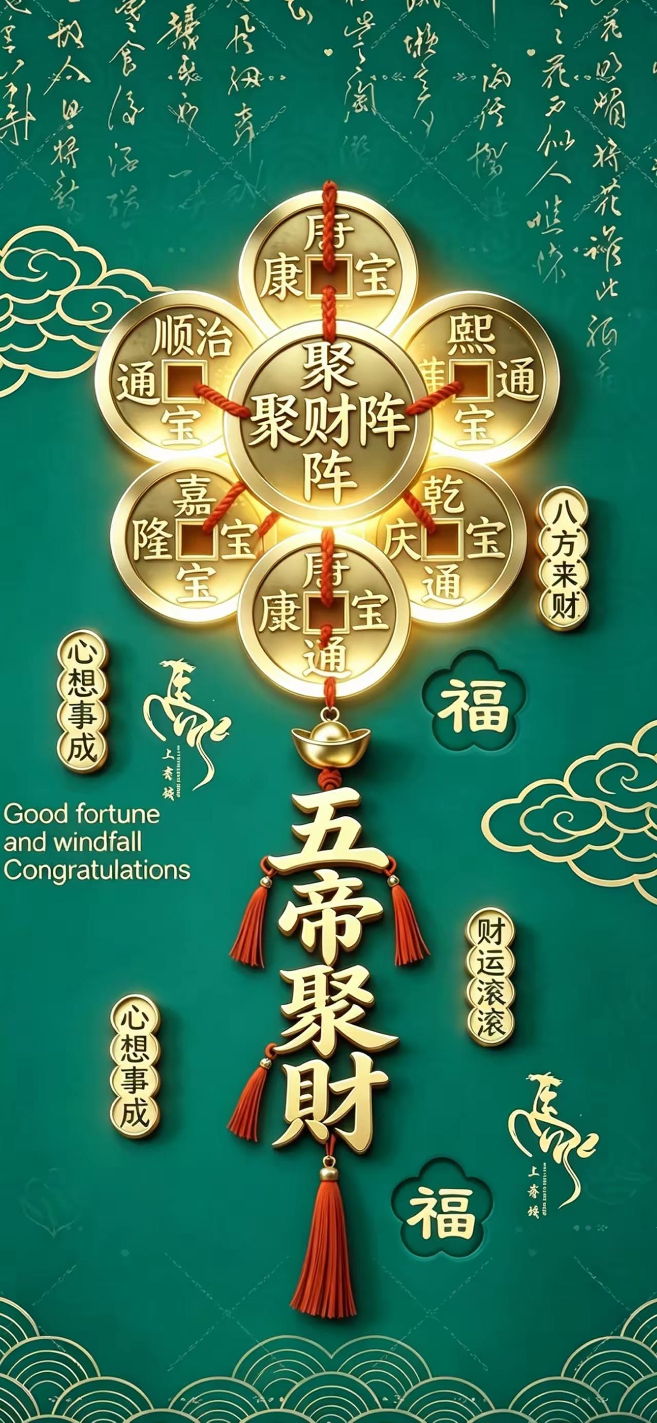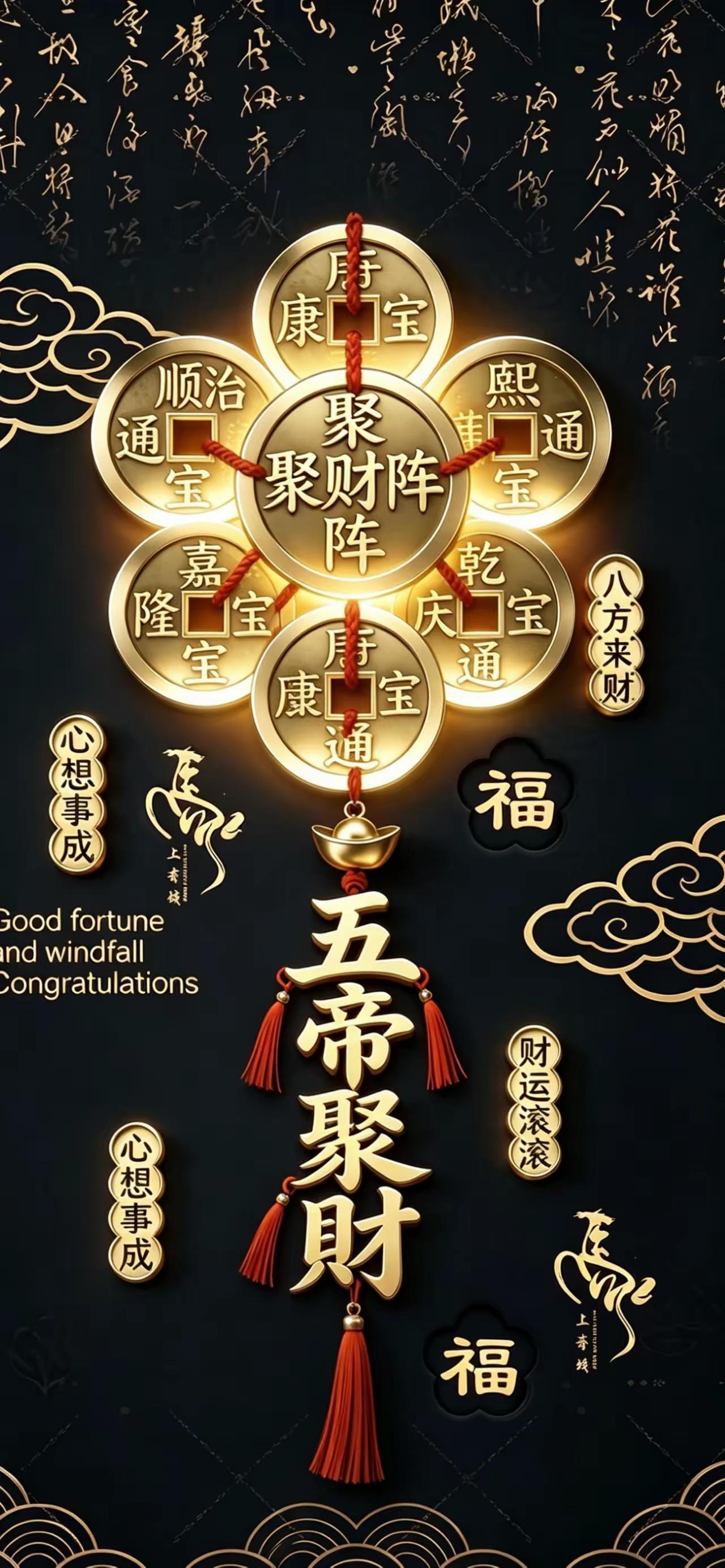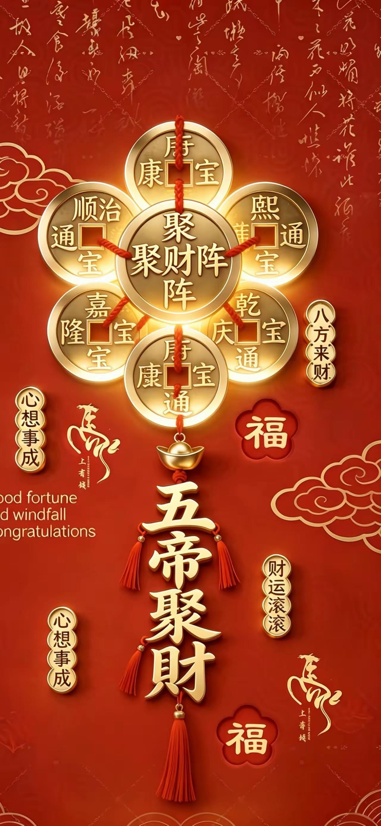 手机壁纸~五帝聚财阵开,八方财气自来。金纹映福,红绳纳祥,愿往后财运滚滚,心想事成,岁岁长安,万事顺遂