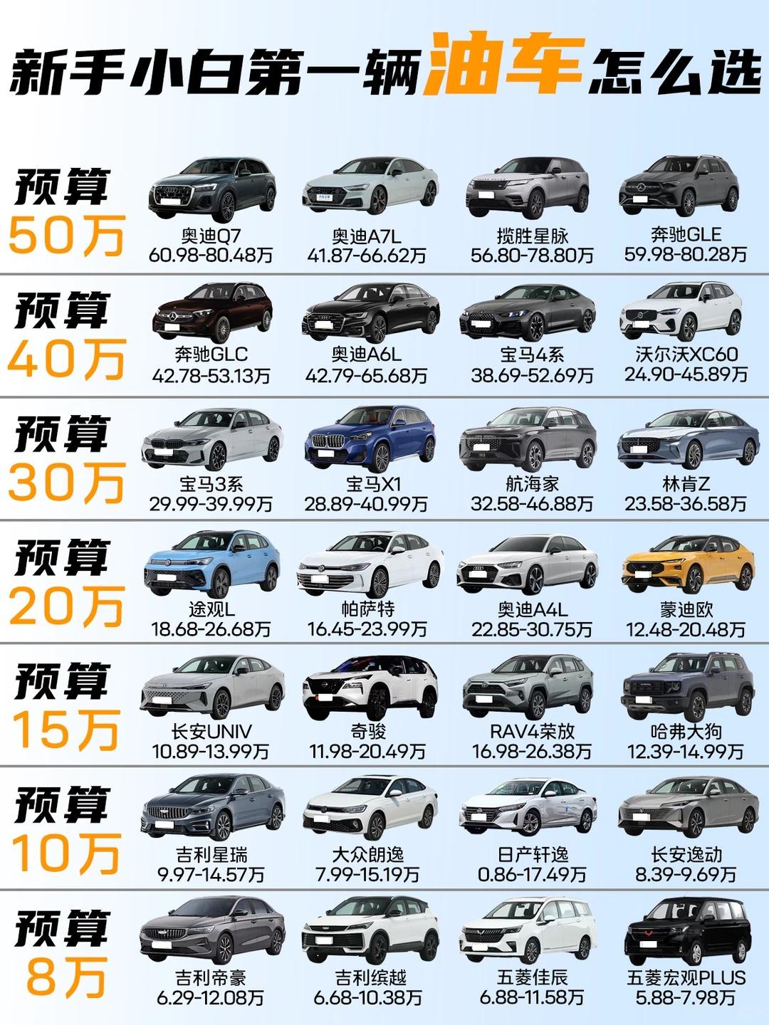 新手小白第一辆油车选购指南✨ 按预算闭眼冲不踩坑! 家人们!第一次买车怕踩坑?直接按预算选就完事了!从8万到50万,全给你安排得明明白白👇 💰 8万入门档:吉利帝豪、缤越,五菱佳辰、宏光PLUS,闭眼入不亏!五菱宏光PLUS神车保值耐造,帝豪是国产家轿常青树,新手练手、代步通勤都合适,性价比直接拉满! 🚗 10-15万家用档:10万级朗逸、轩逸、星瑞,闭眼选不踩雷;15万级UNIV、哈弗大狗、荣放,颜值、操控、通过性全拿捏,年轻人第一台车首选! ✨ 20-30万进阶档:20万级帕萨特、A4L、蒙迪欧,商务家用通吃;30万级宝马3系/X1、林肯Z,豪华感和操控感拉满,打工人冲就完事儿! 🏎️ 40-50万豪华档:40万级奔驰GLC、宝马4系、A6L,面子里子都有;50万级奥迪Q7、奔驰GLE、揽胜星脉,豪华SUV天花板,预算到位直接冲! 总结:8-15万选国产/合资家用,15-30万冲B级车/入门豪华,30万+直接上豪华品牌!【来自懂车帝车友圈】
