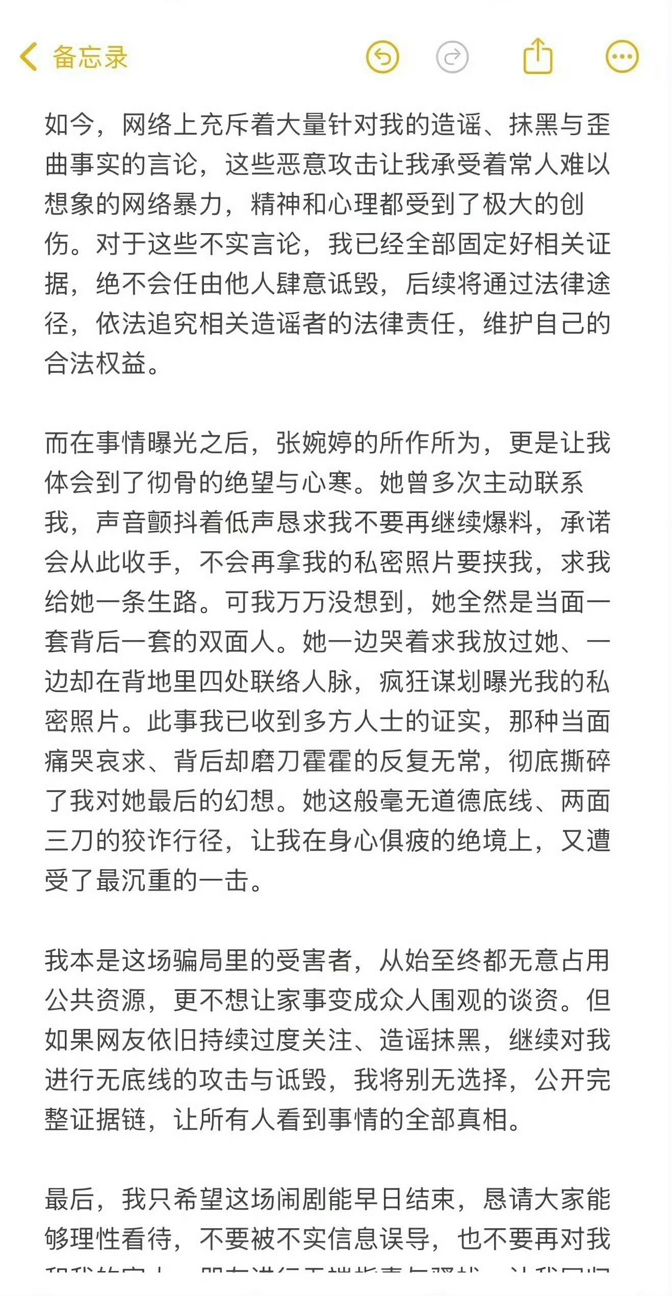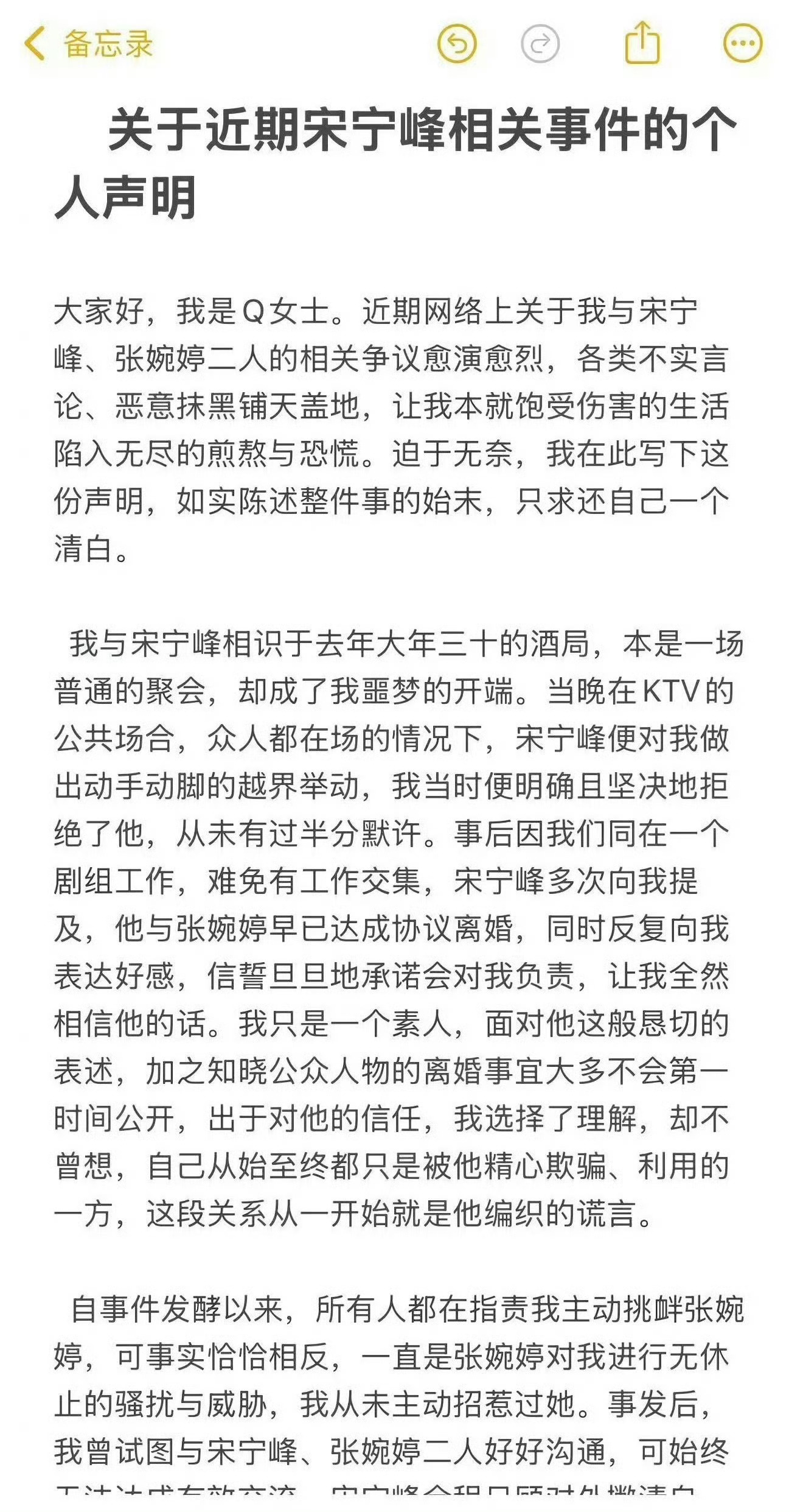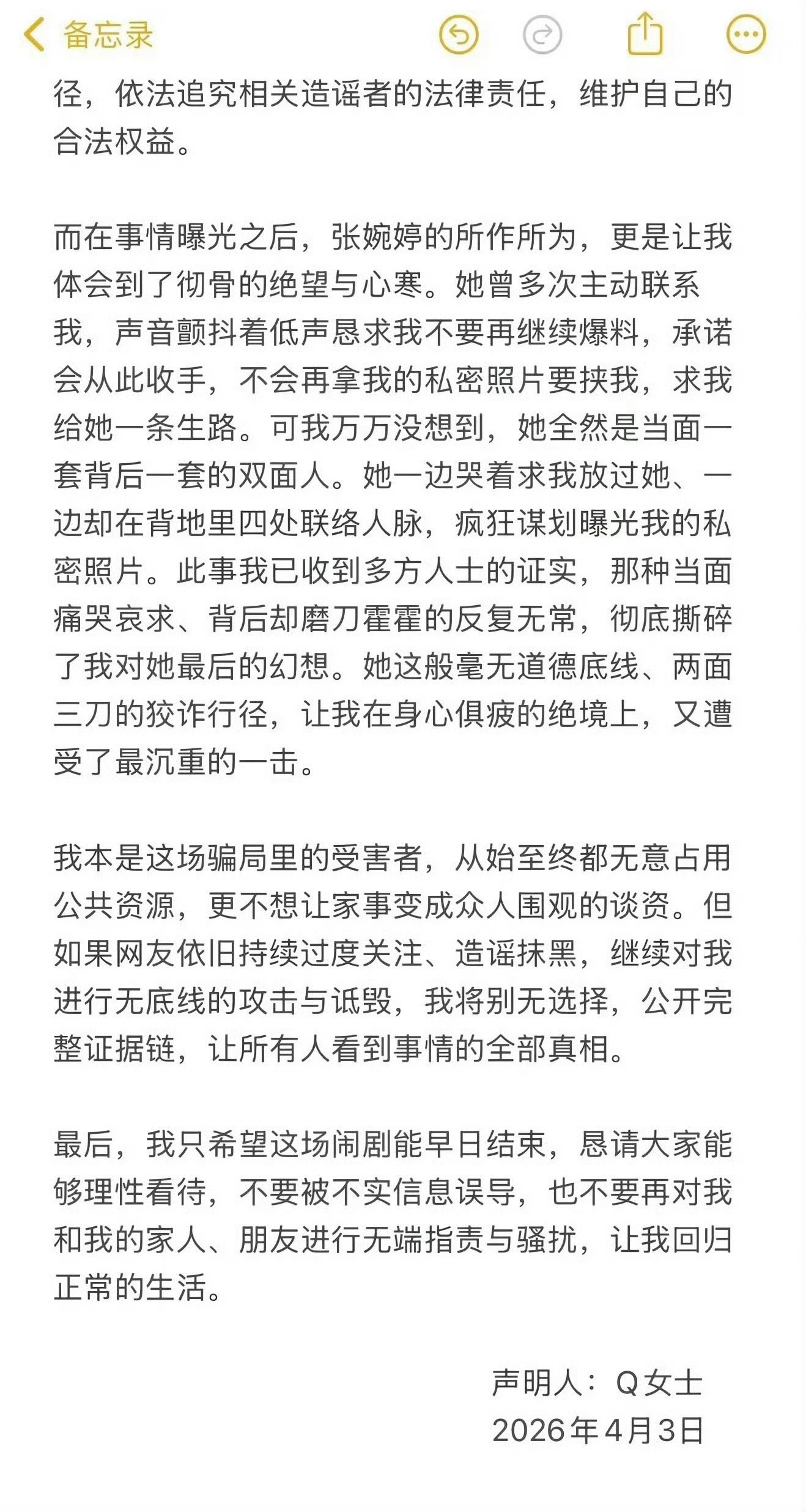 Q女士声明 刚去翻了Q女士抖音“七七睡不醒”,25岁,北京,平时就发发探店。结果摊上这事,被威胁发私密照,换谁都得炸吧。她说张婉婷连她朋友社交账号都去窥探,这也太吓人了,搁我我也得实名开撕。