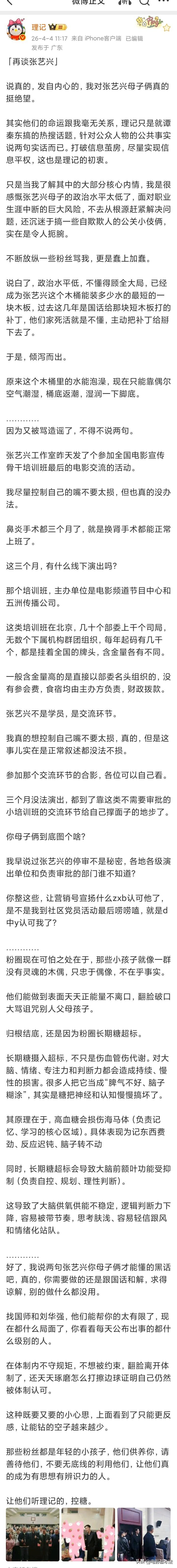 4月4日中午11时17分,理记又又又评论张艺兴了,言辞非常犀利,总结重点有4条: 第一,理记对张艺兴母子绝望了,这对母子ZZ觉悟太低; 第二,张艺兴母子放纵粉丝骂理记,是蠢上加蠢,粉圈太可怕; 第三,张艺兴发的全国电影宣传骨干培训班活动不需要审批就能参加,张艺兴也不是学员,只是参与交流环节; 第四,张艺兴母子找大导演和刘华强已经没用了,这事他们两个能做得有限; 总而言之,理记再次强调张艺兴线下活动已经停审了,理记话里话外的意思就是:张艺兴母子,赶快悬崖勒马吧,不要搬起石头砸自己的脚! 你对理记的最新言论怎么看?
