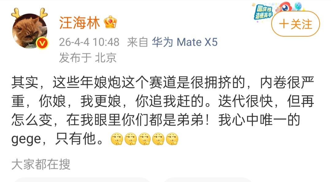 编剧汪海林批评某演艺赛道。4月4日上午10点多钟,编剧汪海林发文说,最近这几年这个赛道可谓是“拥挤”,甚至有你追我赶的趋势。 汪海林进一步说道,这条赛道的人一直在变化,但在我眼里都是弟弟。 汪海林的一番话,其实是想演艺圈多一些阳刚之气。
