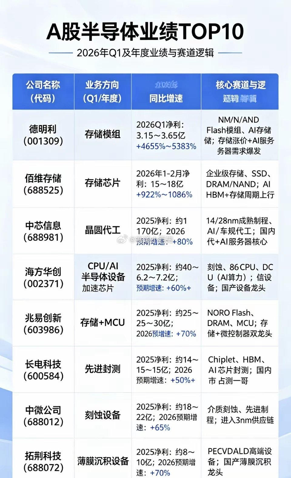 A股半导体业绩TOP101. 德明利 001309|存储模组2026Q1净利:31.5~36.5亿,同比**+4659%~5383%**,扭亏暴增赛道:DRAM/NAND Flash模组、AI存储核心逻辑:存储涨价+AI服务器需求爆发2. 佰维存储 688525|存储芯片2026年1-2月净利:15~18亿,同比**+922%~1086%**赛道:企业级存储、SSD、DRAM/NAND核心逻辑:AI HBM+存储周期上行3. 中芯国际 688981|晶圆代工2025净利:约170亿,2026预期增速**+80%**赛道:14/28nm成熟制程、AI/车规代工定位:国内晶圆代工绝对龙头4. 海光信息 688041|CPU/AI加速芯片2026Q1净利:6.2~7.2亿,同比**+23%~42%**赛道:国产x86 CPU、DCU算力芯片核心逻辑:信创+AI服务器刚需5. 北方华创 002371|半导体设备2025净利:40~45亿,2026预期增速**+60%+**赛道:刻蚀、沉积、清洗设备定位:国产半导体设备龙头6. 兆易创新 603986|存储+MCU2025净利:25~30亿,2026预期增速**+70%**赛道:NOR Flash、DRAM、MCU定位:存储+微控制器双龙头7. 长电科技 600584|先进封测2025净利:14~15亿,2026预期增速**+50%+**赛道:Chiplet、HBM、AI芯片封测定位:国内封测龙头8. 澜起科技 688008|内存接口芯片2025净利:15~18亿,2026预期增速**+65%**赛道:DDR5、HBM接口、CXL定位:全球市占率领先9. 中微公司 688012|刻蚀设备2025净利:18~22亿,2026预期增速**+60%**赛道:介质刻蚀、先进制程核心优势:进入3nm供应链10. 拓荆科技 688072|薄膜沉积设备2025净利:8~10亿,2026预期增速**+70%**赛道:PECVD、ALD高端设备定位:国产薄膜沉积龙头