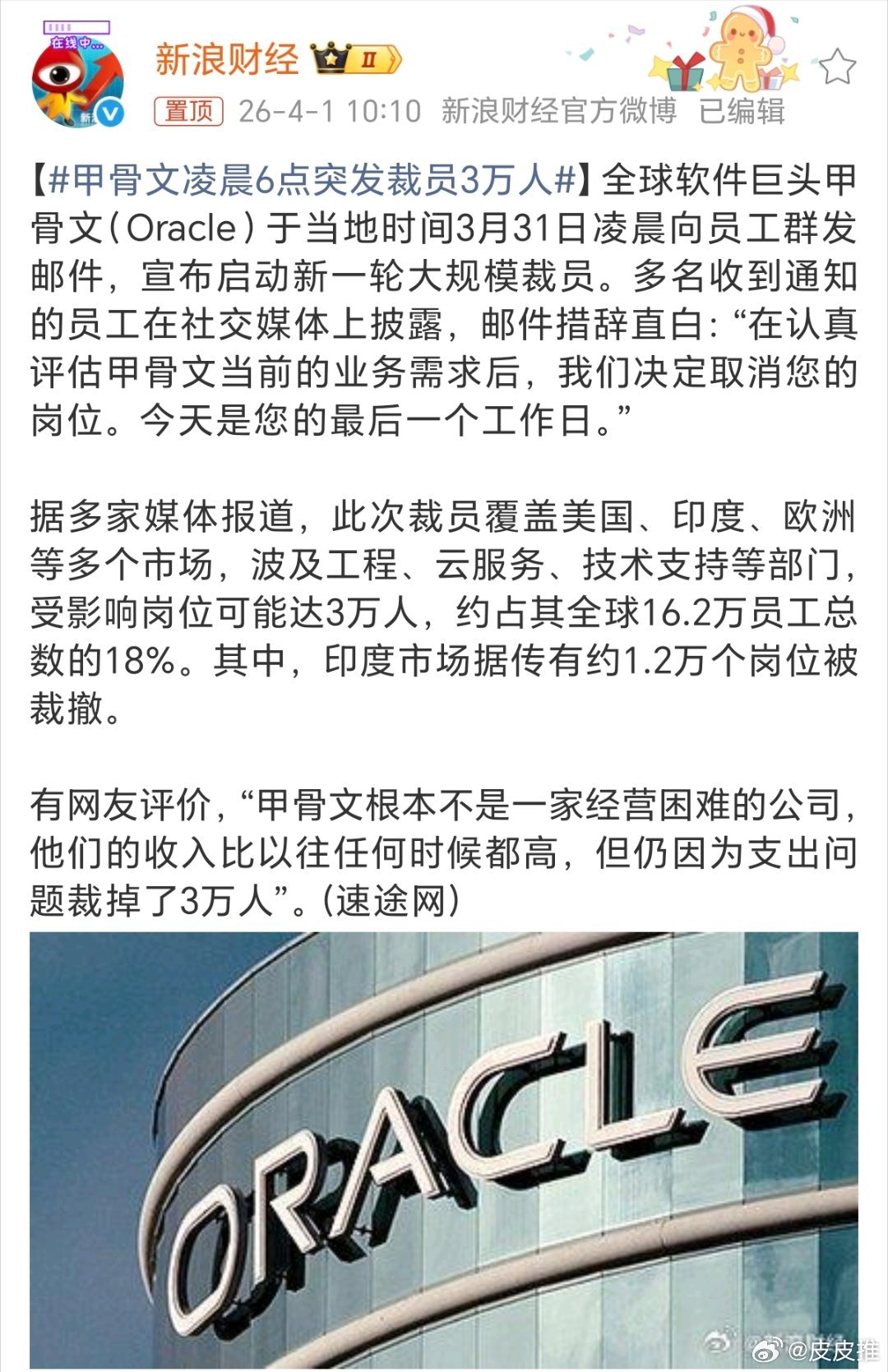 全球软件巨头甲骨文于3月31日凌晨6点启动大一刀切裁员3万人,很多人一觉醒来,工作没了!