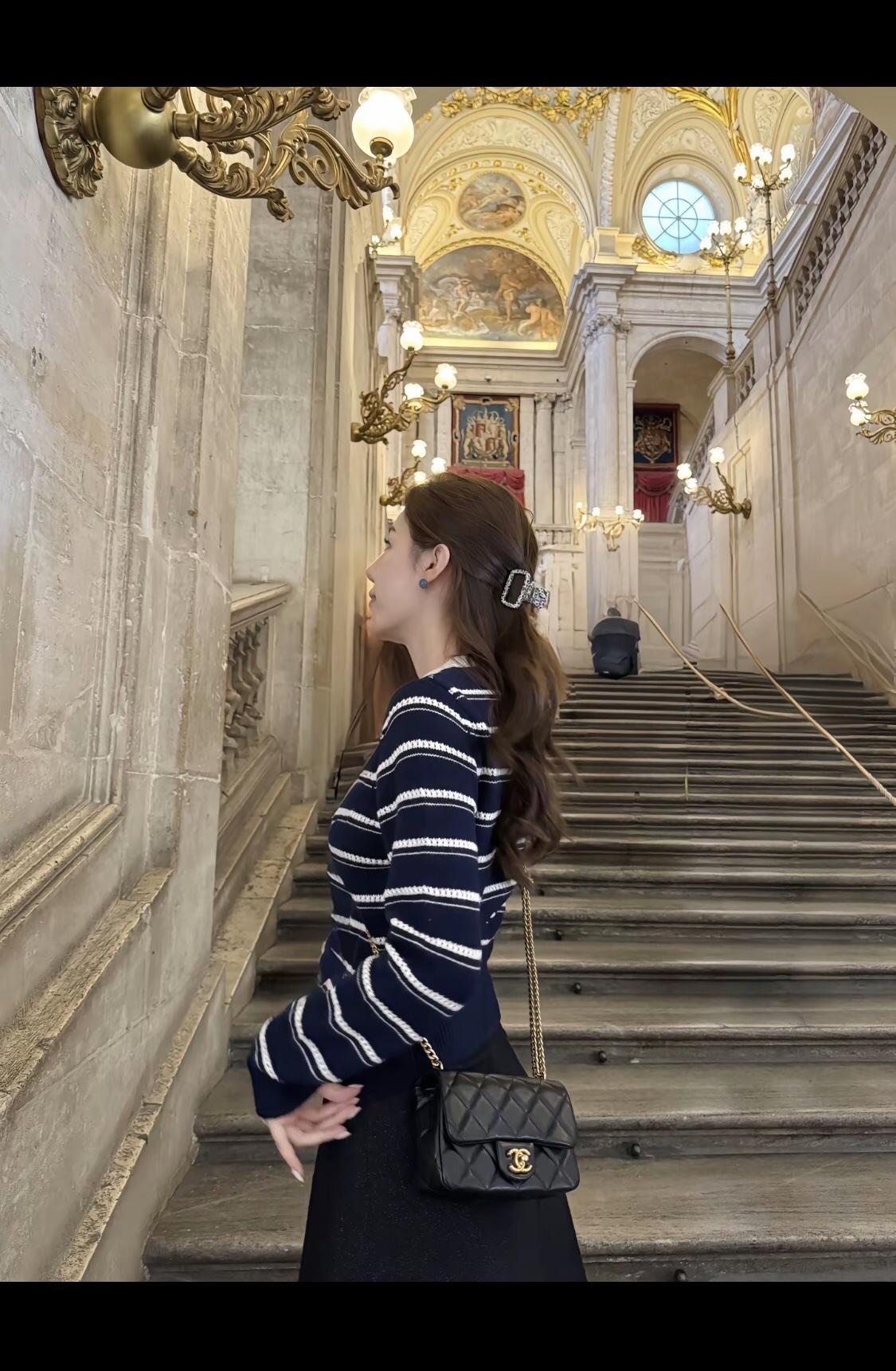 优雅黑衣配格裙,手提包显精致,自信走在自动扶梯上!