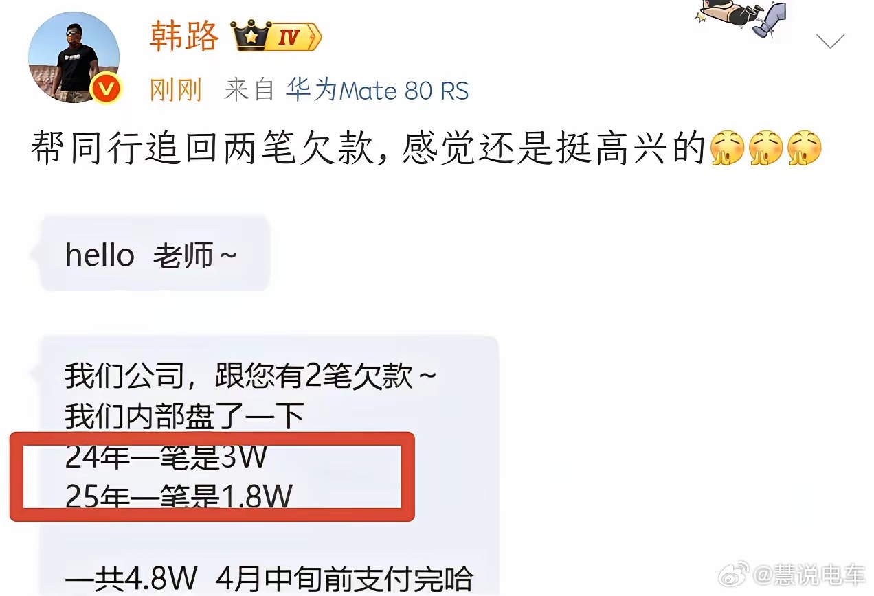 自媒体太难了!看了车评大V韩路刚发的,由衷感叹,他出面 ,才帮同行要回了甲方2024年的欠款,如果他不出面,可能就成烂账,坏账了!而且金额2笔加起来才4.8万,不到5万块,能拖2年,现在的自媒体的确挺乱的。钱不好赚,门槛还低,公关公司也是各种乱。自媒体