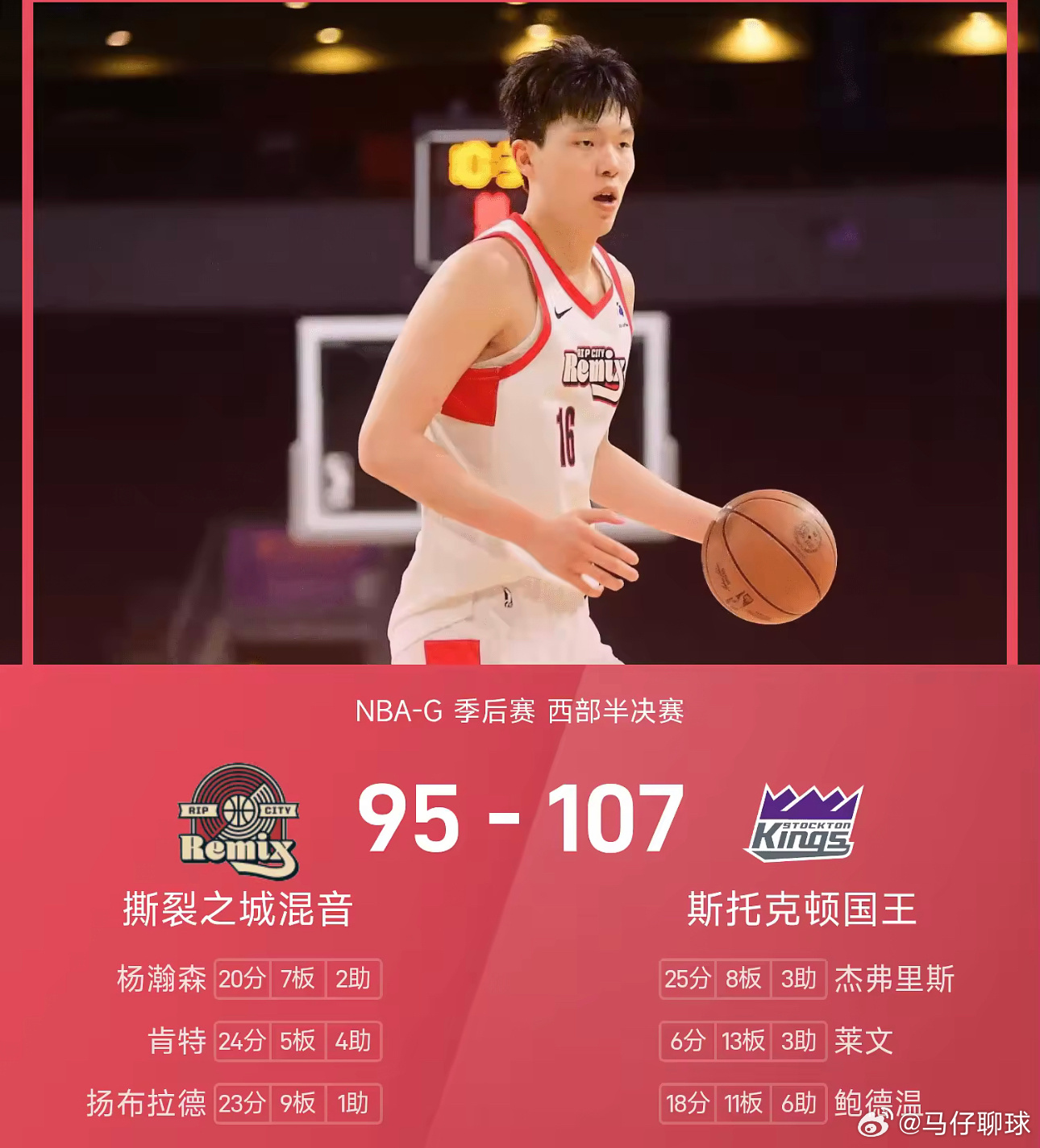 4月4日讯 今日NBA-G联赛季后赛西部半决赛开战,撕裂之城混音客场与斯托克顿国王交手。历经四节比赛的较量混音95-107不敌国王被淘汰,国王晋级西部决赛。杨瀚森今日贡献了20分7篮板2助攻。