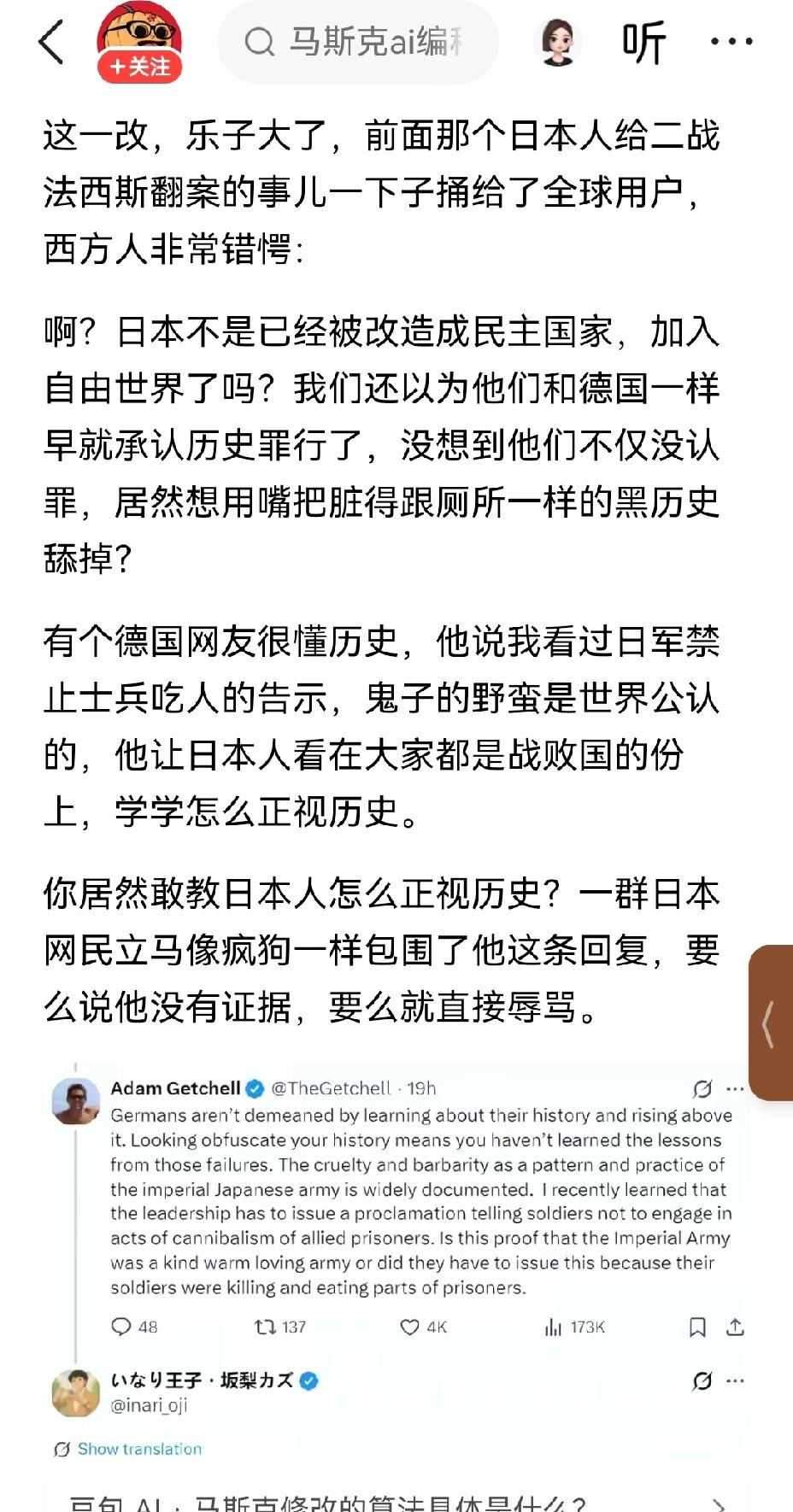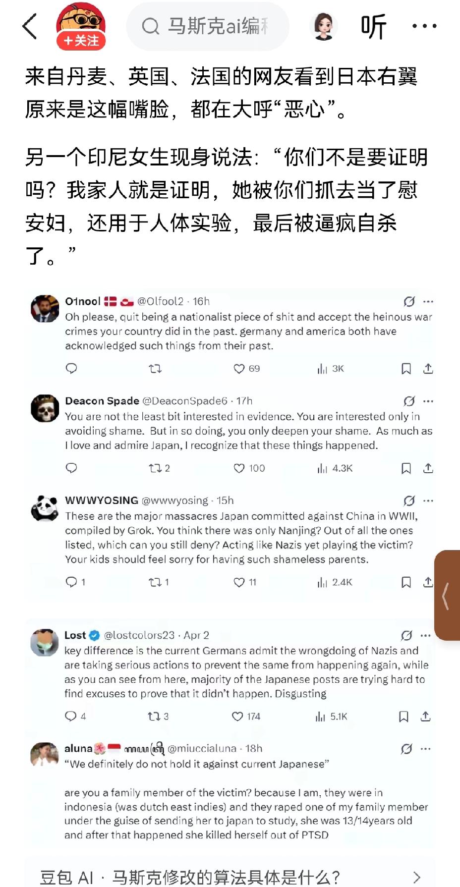 【马斯克改变算法:日本教材隐瞒二战侵略真相曝光于全世界】马斯克改算法这事太牛了,直接把日本隐瞒二战侵略真相的破事曝光给全球网友。 马斯克在2026年初对X平台推荐算法的修改。此前,X平台的内容推荐基本按语言和国家分区,日语内容像被关进了独立的“信息小黑屋”,只在日本用户圈内传播。 日本网民和右翼群体长期在日文区肆无忌惮地歪曲历史、美化侵略,笃定外国网友看不懂日文,也不会主动关注,形成了一种扭曲的“语言安全感”。 但马斯克的新算法打破了这道壁垒,日语内容开始被自动翻译并推荐给全球用户。这一改,日本网络上那些否认南京大屠杀、洗白731部队、为侵略战争翻案的言论,瞬间毫无遮挡地暴露在中文、英文、德文等全球各路网友眼前,一场围绕历史真相的激烈论战就此爆发。 日本教科书篡改历史,并非一朝一夕之事,而是长达数十年的系统性操作。早在上世纪50年代, 日本政府就开始动手脚,1958年岸信介政府首次将“侵略中国”改为“进入中国”,埋下了歪曲历史的种子。 1982年,文部省更是明确要求把“侵略华北”替换为“进出华北”,用看似中性的词,彻底洗白日军的暴力侵略本质。 此后数十年,这种篡改愈演愈烈:南京大屠杀被轻描淡写成“南京事件”,30多万遇难者的明确数字,被替换成“尚无定论”“仍在研究”的模糊表述; 慰安妇制度被彻底删除,只以“女性在战地被迫工作”含糊带过,完全无视性奴隶的残酷真相; 731部队的活体实验、细菌战等反人类罪行,要么被彻底抹去,要么只字不提。 这种篡改早已渗透进日本基础教育的方方面面。 日本80%的初中使用新版教材,主流历史课本几乎都回避明确的侵略罪行表述。长期的历史洗脑,让日本年轻一代的历史认知严重扭曲。 有日本教师坦言,原本持反战态度的学生,上完历史课竟会被误导,觉得日本是“被迫应战”。还有调查显示,超三成日本年轻人对侵华战争的侵略性质一无所知,整个社会陷入“只记自己受害,不认自己加害”的集体失忆,形成了顽固的历史认知茧房。 算法调整后,全球网友的反应格外激烈。中国网友纷纷搬出南京大屠杀史料、幸存者证词、日军日记等铁证,逐条驳斥日本网民的谎言;德国网友直言,同为二战战败国,日本该学学德国正视历史、彻底反省的态度; 就连不少美国网友也站出来发声,指出日本一边控诉广岛长崎核爆的伤害,一边否认自身战争罪行,是典型的双重标准。 印尼、韩国等曾遭日本侵略的国家网友也纷纷现身,分享家人遭受日军暴行的亲身经历,用真实苦难戳破日本的历史谎言。 眼看舆论一边倒,日本右翼网民开始耍无赖,疯狂上传伪造的“中日亲善”照片,反复刷屏虚假言论,试图污染X平台AI的资料库,想让AI也跟着歪曲历史。但在铁证如山的历史事实面前,这些小动作根本不堪一击。 X平台的AI助手Grok更是直接“硬刚”,面对日本网友的狡辩,直接抛出南京大屠杀30万遇难者、731部队活体实验等史实,还附上东京审判记录、拉贝日记等权威史料链接,让日本右翼的谎言彻底无所遁形。 马斯克这次看似不经意的算法改动,本质上是用技术手段打破了信息壁垒,让被掩盖的历史真相重见天日。 它不仅曝光了日本教科书长期篡改历史的黑幕,更让全球看清:日本社会对二战侵略历史的回避与美化,从来不是个别现象,而是有教材、有舆论、有社会氛围支撑的系统性问题。 历史从不是任人打扮的小姑娘,侵略罪行更不会因文字篡改就消失。 日本若一直躲在谎言里逃避责任,不仅永远得不到亚洲邻国的真正谅解,更会让自己的年轻一代失去对历史的敬畏,在错误的认知中越走越远。 这场由算法引发的历史真相大曝光,也给所有人提了个醒:铭记历史、捍卫真相,从来都不是某一个国家的事,而是全人类共同的责任,任何试图掩盖、歪曲历史的行为,终究会被真相戳穿,被全世界唾弃。
