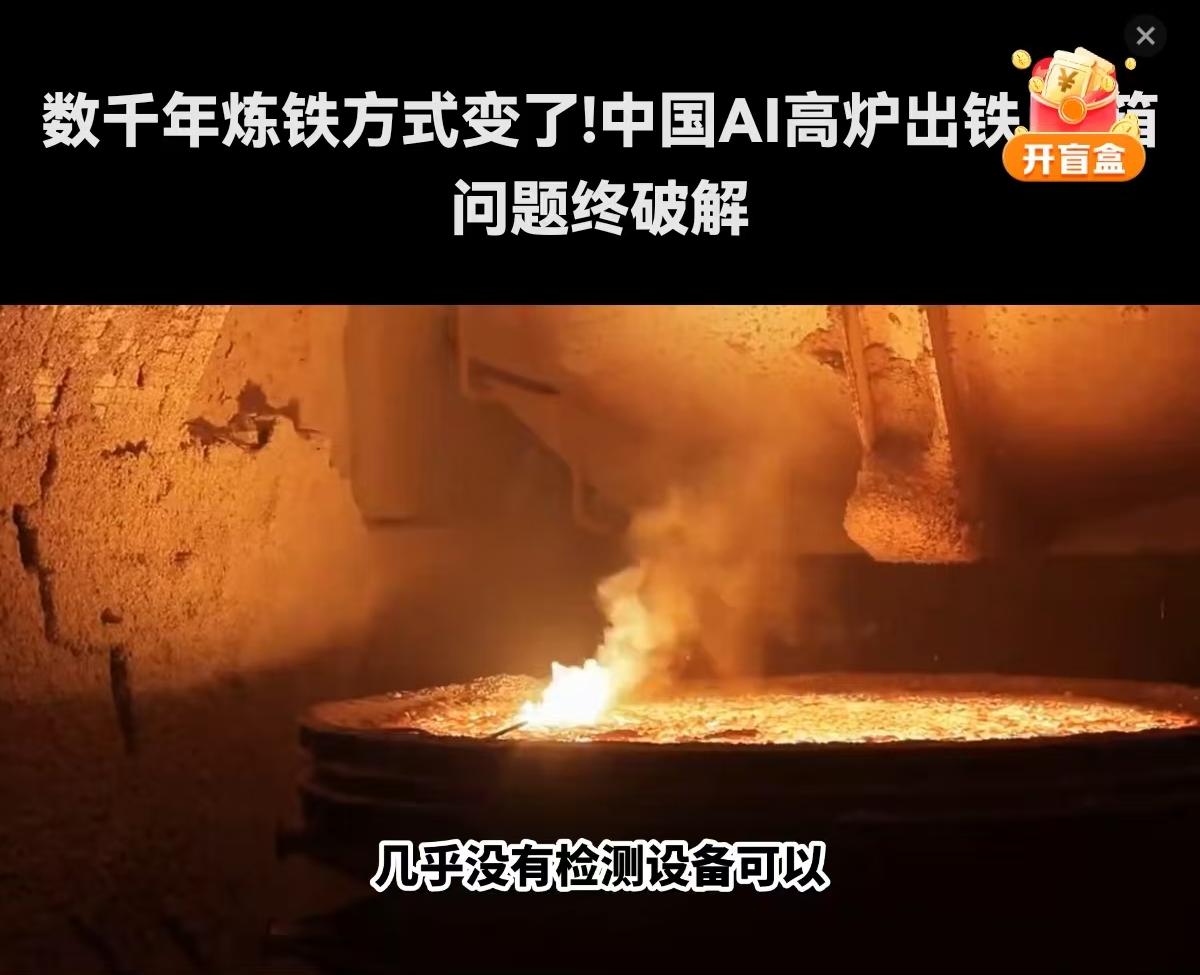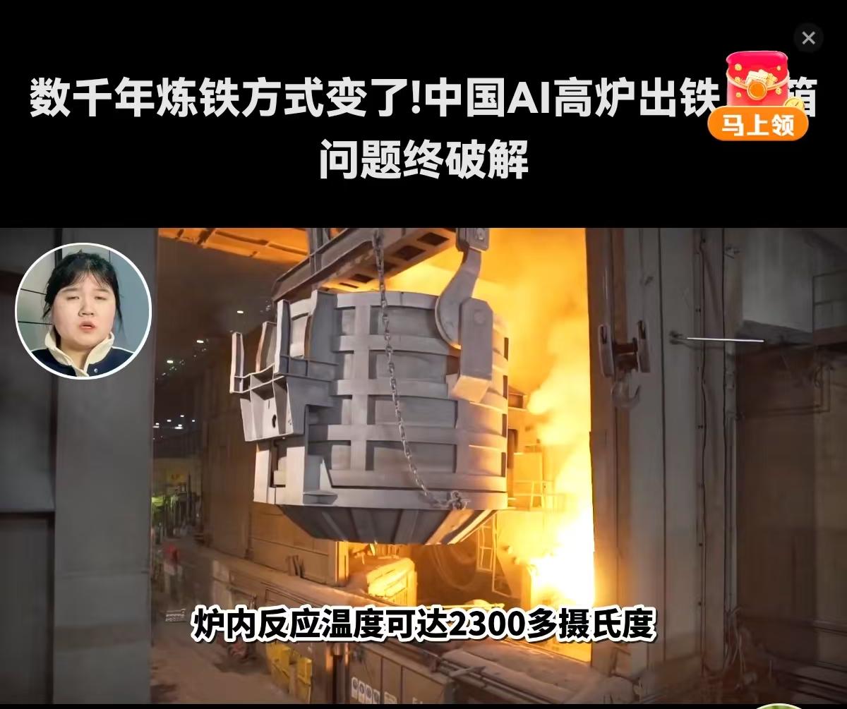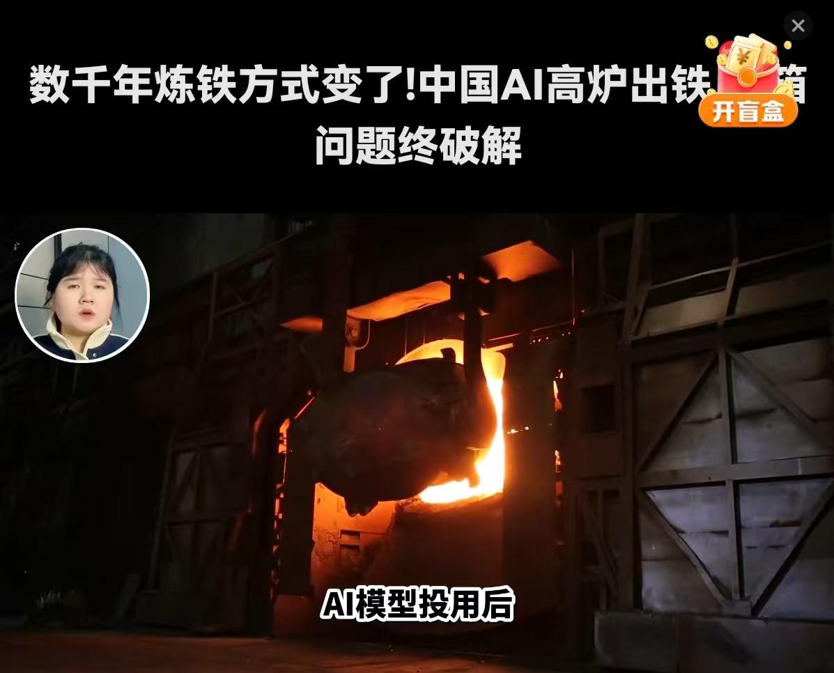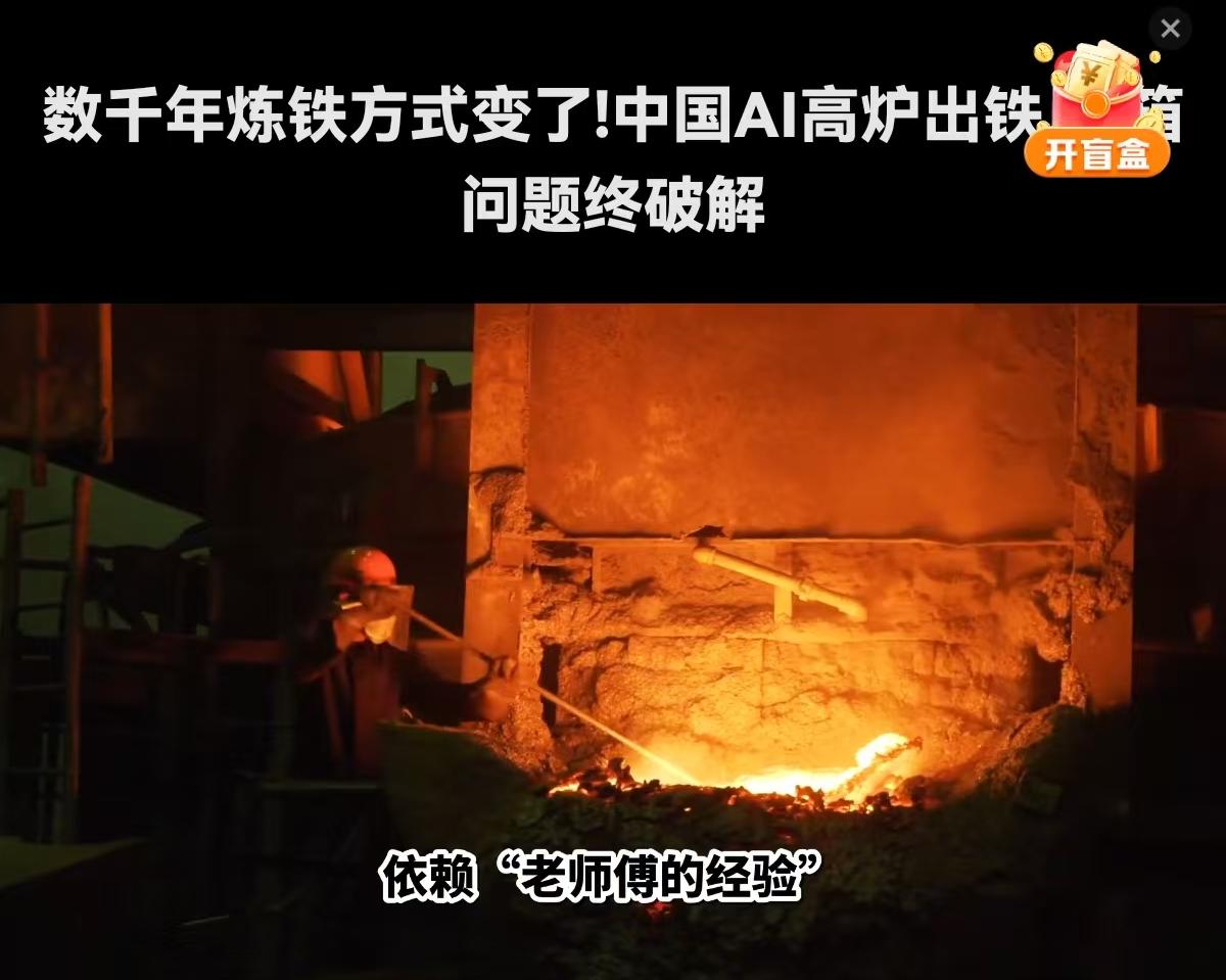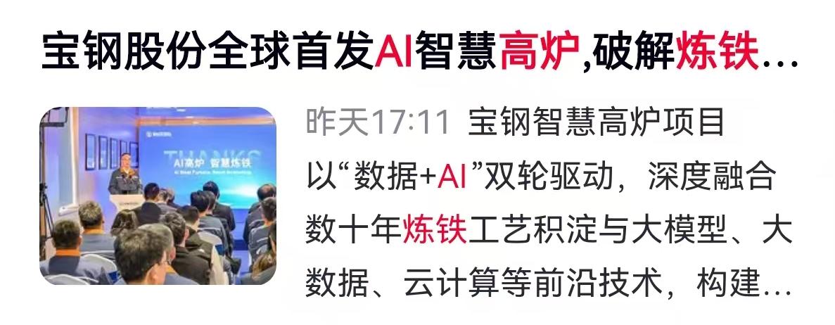 数千年炼铁方式彻底改变!中国宝钢AI高炉正式出铁。4月3日全球首发,AI替代人工经验,破解高炉“黑箱”难题,预测命中率超90%,实现降本、增效、低碳,开创钢铁行业智能化革命里程碑。 技术突破与实效 预测精度:核心AI模型对铁水温度、硅含量的2小时预测命中率超90%,实现全自动闭环控制。 合作开发:由宝钢股份联合宝信软件、华为共同研发,覆盖原料至炼铁全流程。 能效提升:燃料消耗持续下降,铁水质量稳定性显著提高,单座高炉年创效超千万元。 行业里程碑意义 全球首创:首次实现高炉炼铁全流程智能化,推动钢铁行业向绿色低碳转型。 战略落地:宝钢股份2024年启动的AI战略进入成果转化阶段,智慧高炉为标杆项目。 宝钢股份全球首发AI智慧高炉,破解炼铁“黑箱” 难题 昨天 宝钢智慧高炉项目以“数据+AI”双轮驱动,深度融合数十年炼铁工艺积淀与大模型、大数据、云计算等前沿技术,构建覆盖原料、烧结、炼焦、高炉炼铁全流程的感知-决策-执行闭环智能管控体系,实现从“经验驱动”到“数据驱动”、从“被动应对”到“主动预测”的根本转变,成功破解高炉“黑箱”调控难题。数据显示 上观新闻
