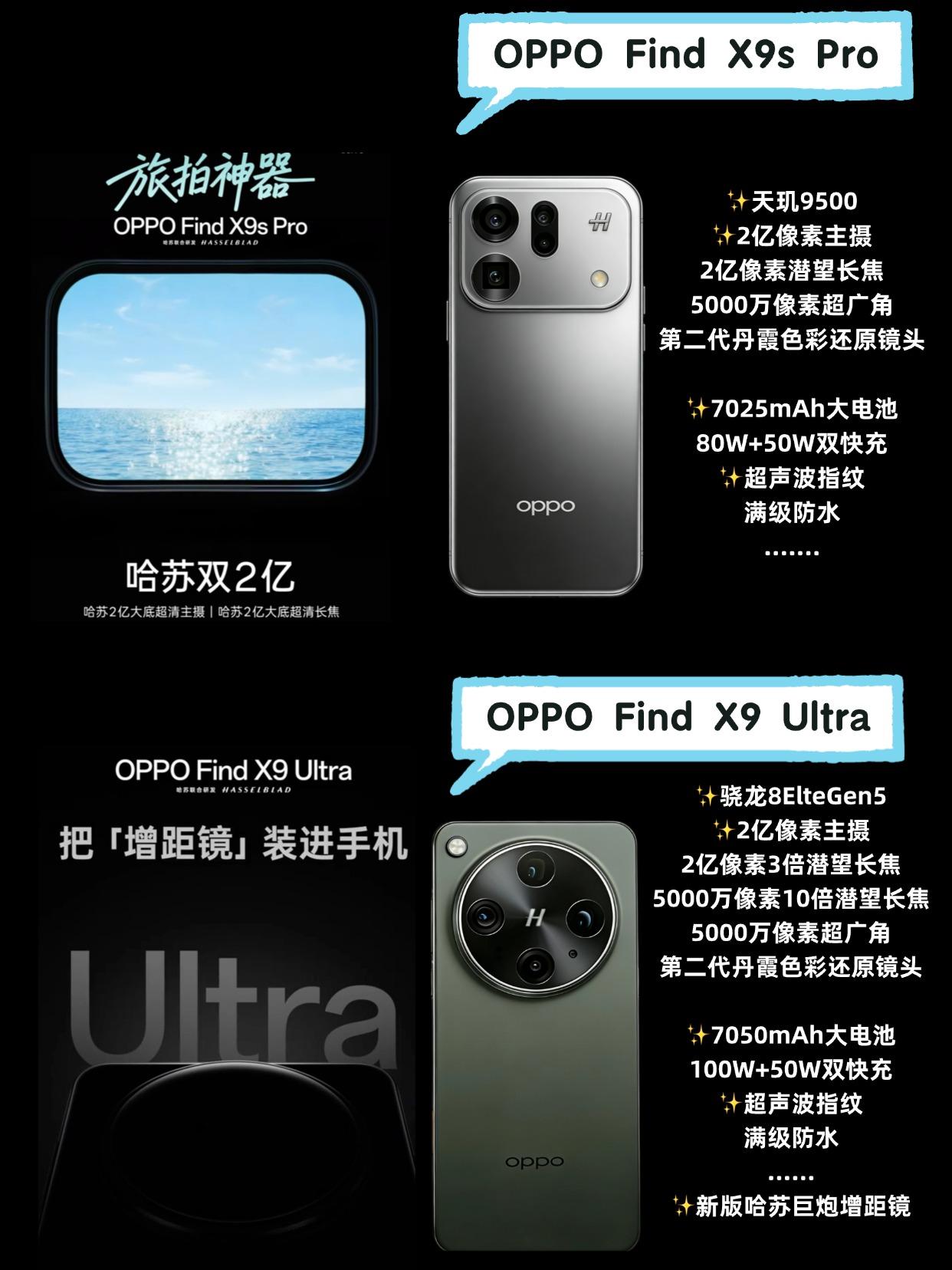 五一演唱会拍图纠结症犯了!选哪款手机好? 最近想换台手机五一去看演唱会,结果数码圈朋友跟我说,今年手机普遍因为成本涨价,现在换其实有点亏,还劝我要么不换,要换就选升级特别实在的。还说今年OPPO产品力特别卷,说什么2026是 OPPO 旗舰升级大年🤔,可以重点看看。 - 我一去做功课直接纠结住了,Find X9s Pro 和 Find X9 Ultra 到底怎么选啊! - X9s Pro屏幕用的是新一代1nit明眸护眼屏,行业首个莱茵低动态干扰认证,据说屏幕文字会很清晰易读,护眼效果很顶。影像给到了双2亿像素,拍演唱会很重要的长焦是2亿像素,估计拍照很强,而且电池有7025mAh配 80W 有线+50W 无线,机身才 198g 左右,在外一天不用担心没电。 - X9 Ultra 则偏向全能旗舰,7050mAh 大电池+100W 快充,还有仿生震感马达+对称双扬,外围配置给足,影像听说更强,不止有双2亿像素,还有10倍光变长焦,很像是给手机内置了增距镜。两台影像都很强,只是定位不同。 - 我日常刷剧、出门拍照、看演唱会都用,两台都适配我,真的太难选了。发布会 4 月 21 日开,不知道五一前能不能现货买到啊,大家帮我支支招! - 五一假期 演唱会手机 选手机 手机数码 OPPO OPPOFindX9sPro OPPOFindX9Ultra 手机爆料