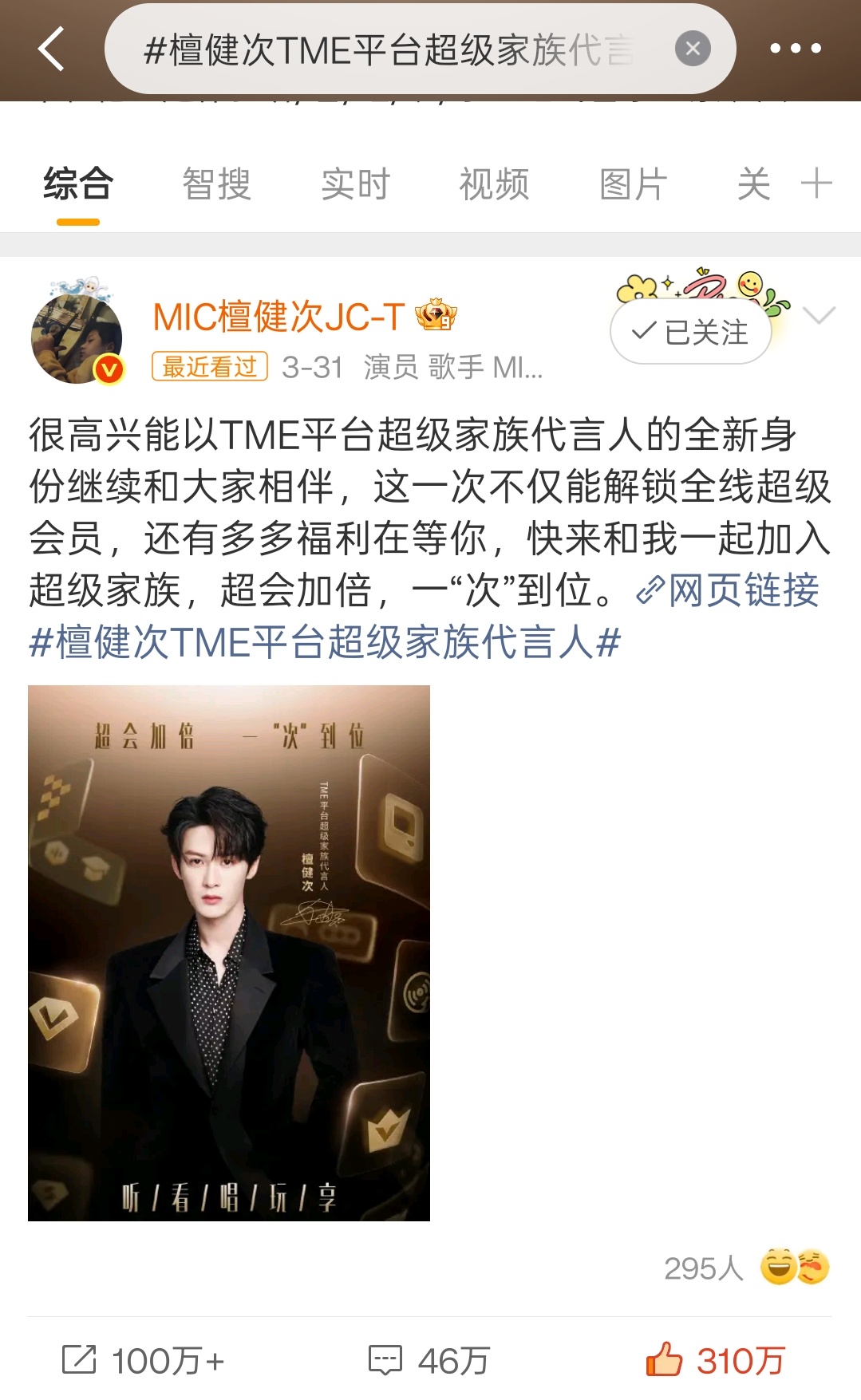 转已达百万,可以补评补👍🏻了,瓶冲百万檀健次TME平台超级家族代言人‖檀健