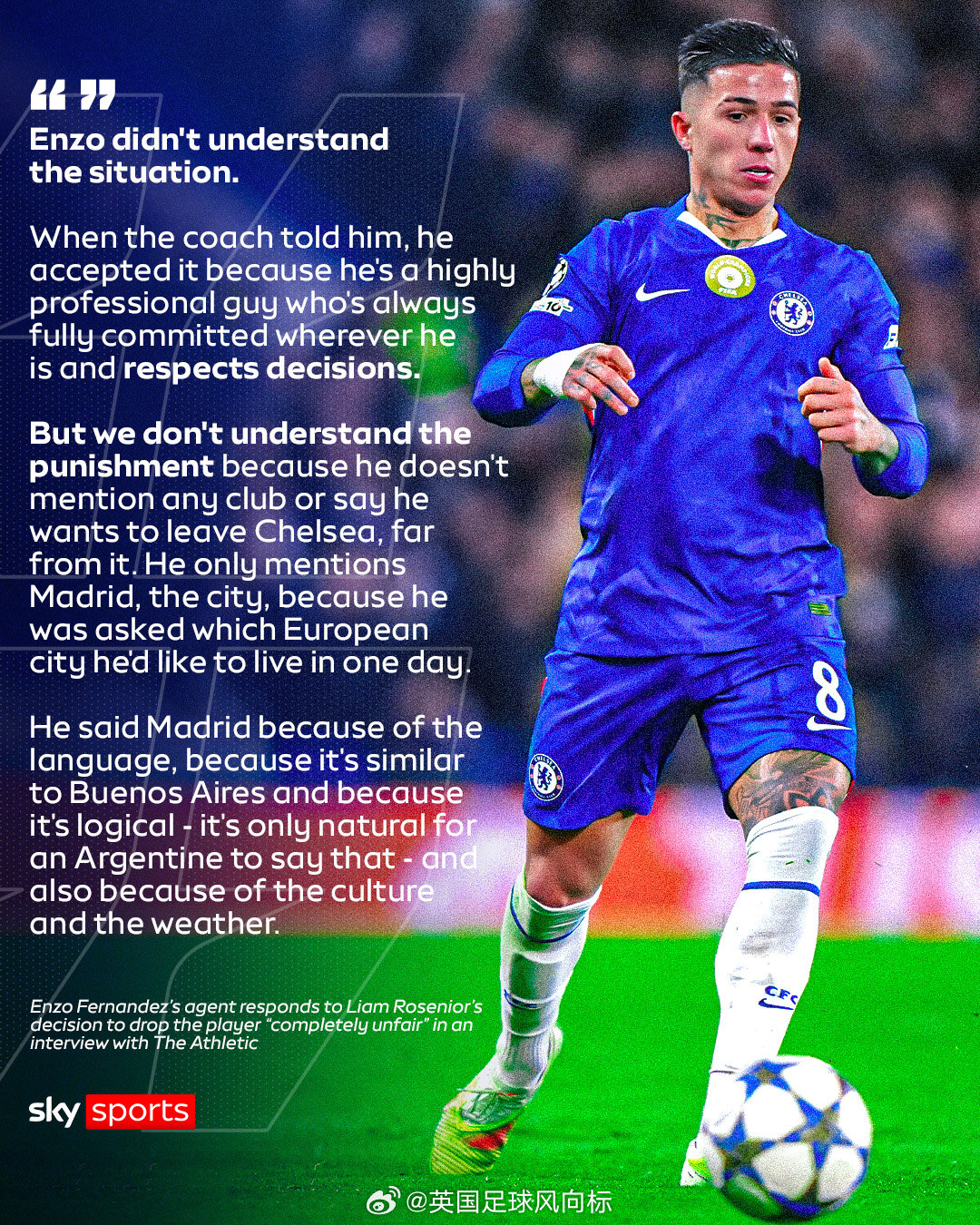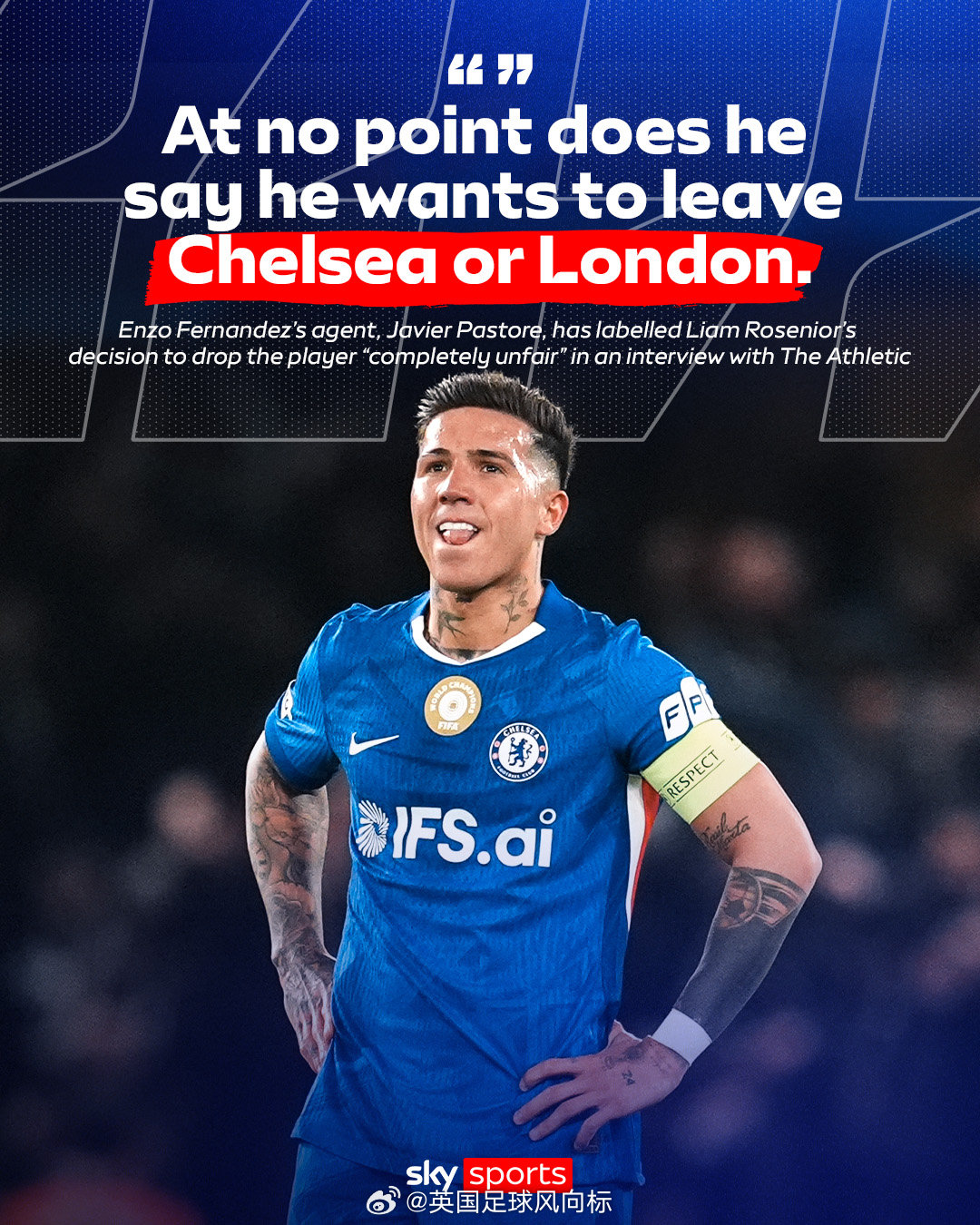 恩佐从未说过他想离开切尔西或伦敦,切尔西主帅罗塞尼尔,在接下来两场比赛弃用恩佐的决定,是完全不公平。