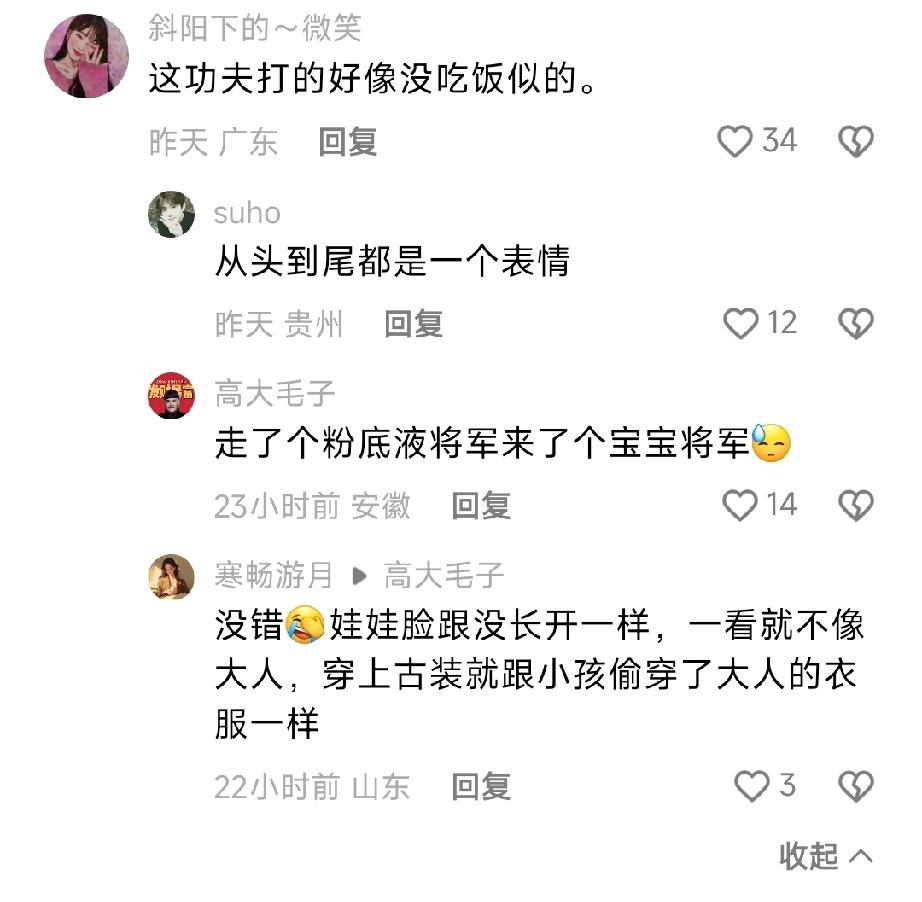 黄杨钿甜被叫“儿童将军”、“宝宝将军” 网友说她的打戏跟没吃饭一样,还有人吐槽:走了个粉底液将军来了个宝宝将军[汗] 如果冰湖重生是续集,那这个“楚乔”真是逆生长啊!越长越小,干脆说楚乔前传得了。 女主都能叫男主叔叔了,这CP怎么嗑?李昀锐站她旁边,跟带孩子一样…… 跟赵丽颖饰演的巾帼形象,简直无法相提并论。 黄杨钿甜