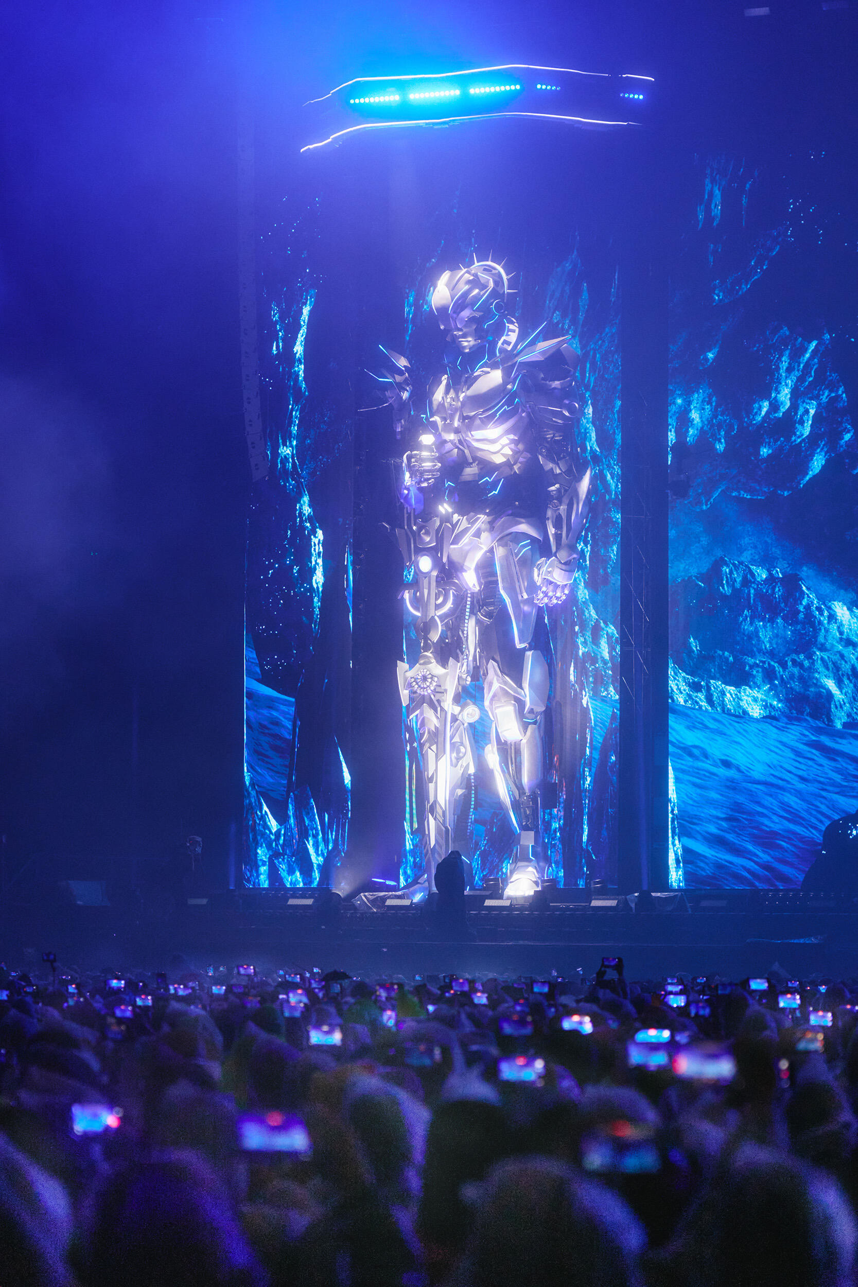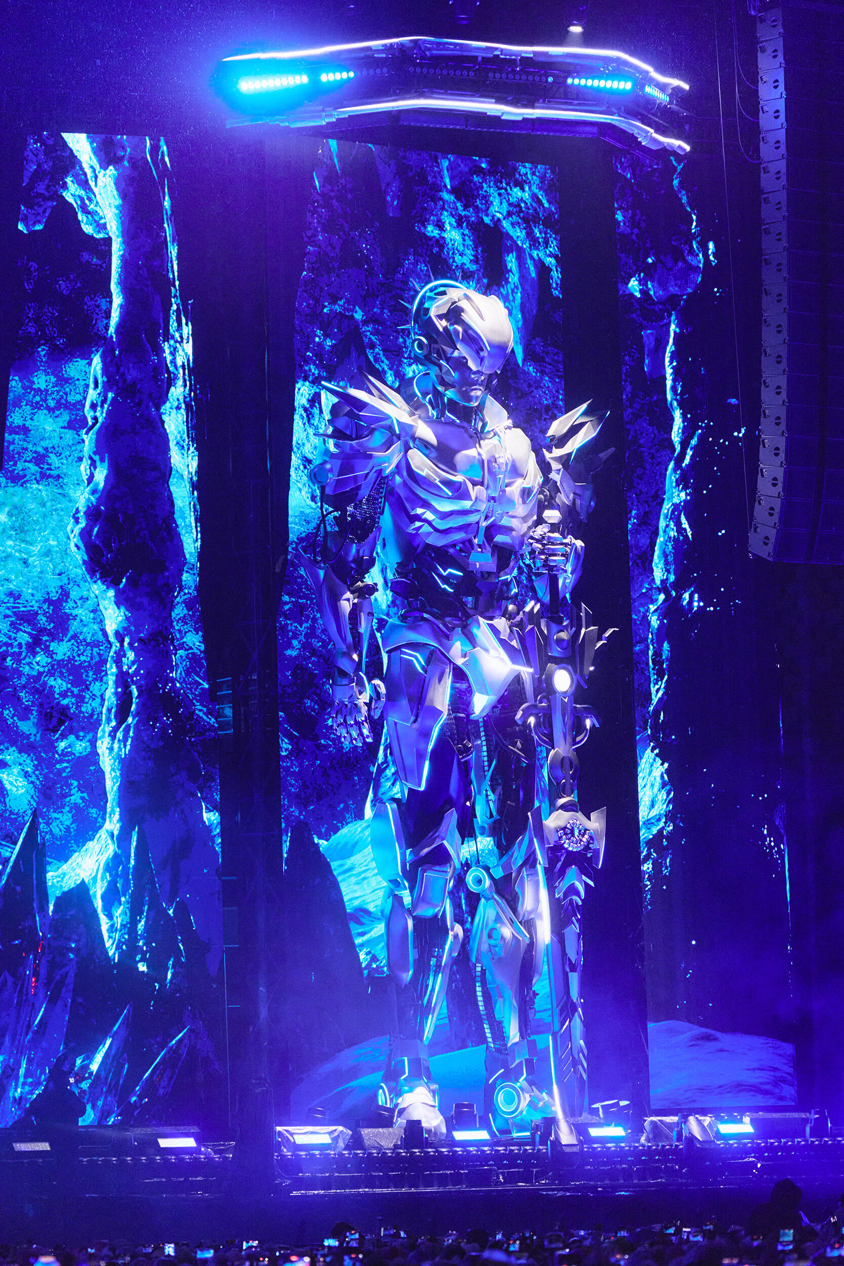走进周杰伦的音乐世界,目光所及尽是惊喜!歌迷一入场就看到两座 12 米高的巨型机器人矗立在舞台两侧,慑人的气势仿佛进入了周杰伦的音乐殿堂,开场以视觉特效打造的「冰封世界」震撼所有观众的眼球,随着大雪融化、激光切出一道门,「环状炸水」特效喷发!舞台前方观众也身临其境感受到水花淋漓的畅快,而随之映入观众眼帘的是 14 米高巨型机甲,当机甲开启它的座舱,「太阳之子」周杰伦以王者归来的气势,一现身就融化了「冰封世界」,一连带来「太阳之子」「无双」两首阳刚正气的歌曲,气势非凡!周杰伦与 28 位身着荧光服的舞者,以热力四射的舞蹈,燃爆全场粉丝热情!