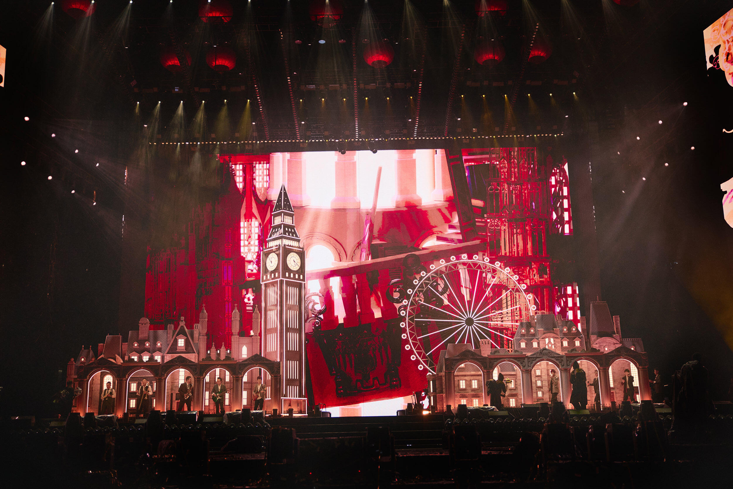 随着「大笨钟」前奏响起,眼前的场景缓缓置换成梦幻的城堡、旋转摩天轮与大笨钟,粉丝仿佛一秒进入伦敦的童话世界!周杰伦以帅气的英伦风造型唱着俏皮的「大笨钟」,再衔接「粉色海洋」,与 9 位乐手老师以及 Gary 杨瑞代一同带领歌迷遨游浪漫的粉色童话里。