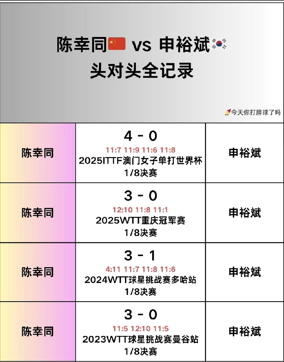 世界杯四分之一决赛陈幸同VS申裕斌 图二是过往战绩 图一是实时比分 第四局11-0,加第三局五分 申裕斌连得16分 现在是赛点8-10,期待奇迹