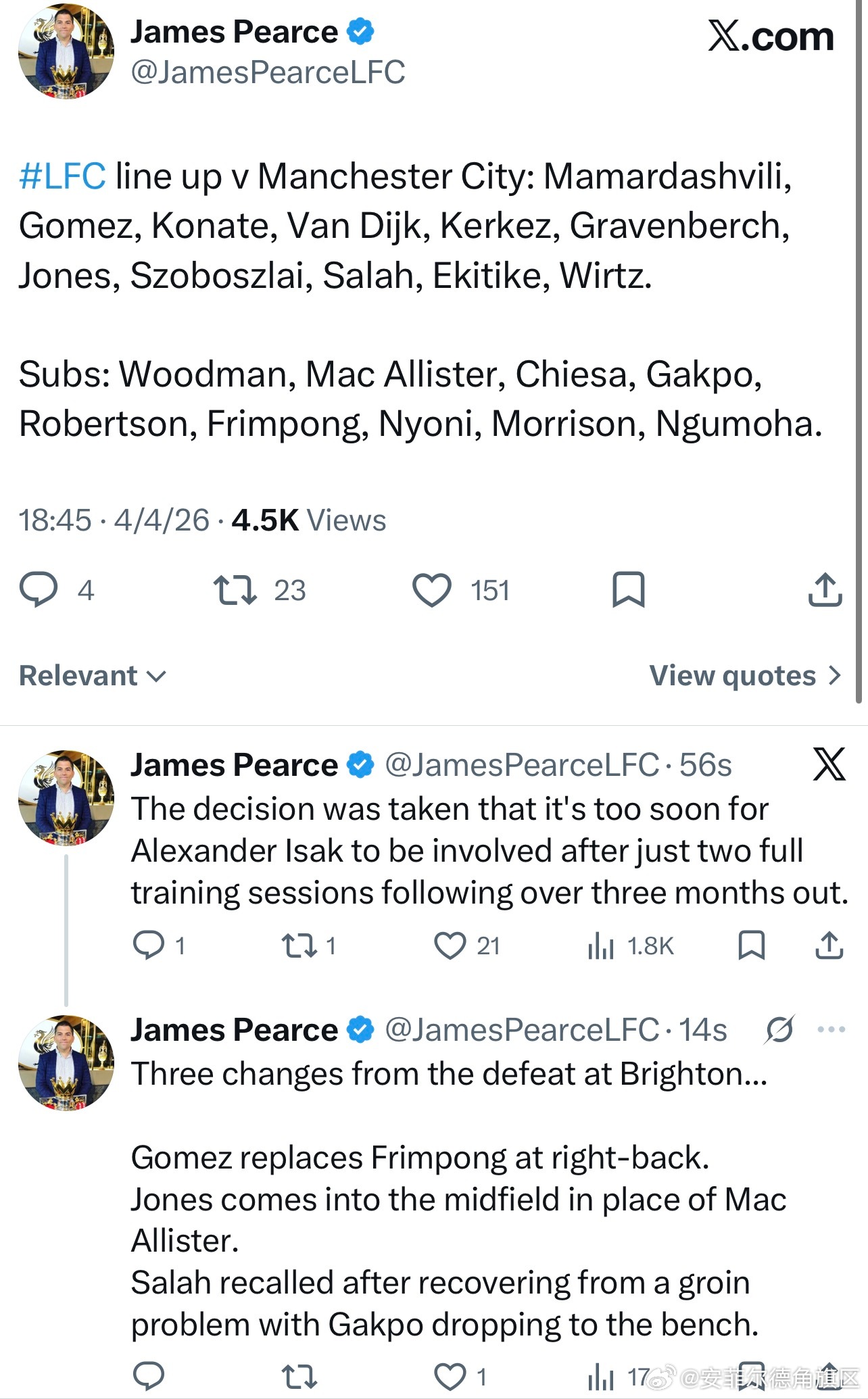 首发阵容出来了,萨拉赫埃基蒂克和维尔茨首发,琼斯顶替麦卡首发,弗林蓬在替补席。伊萨克没进大名单,老皮说缺席缺席三个月之后才参加两趟训练课就进入比赛大名单对于伊萨克来说还是太早了。那应该是踢大巴黎要进大名单了