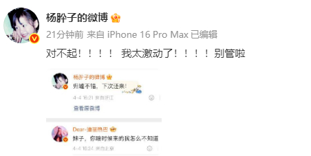 迪丽热巴回复杨肸子,杨肸子演我追星迪丽热巴,哈哈哈换谁不激动呢?今晚继续来白日提