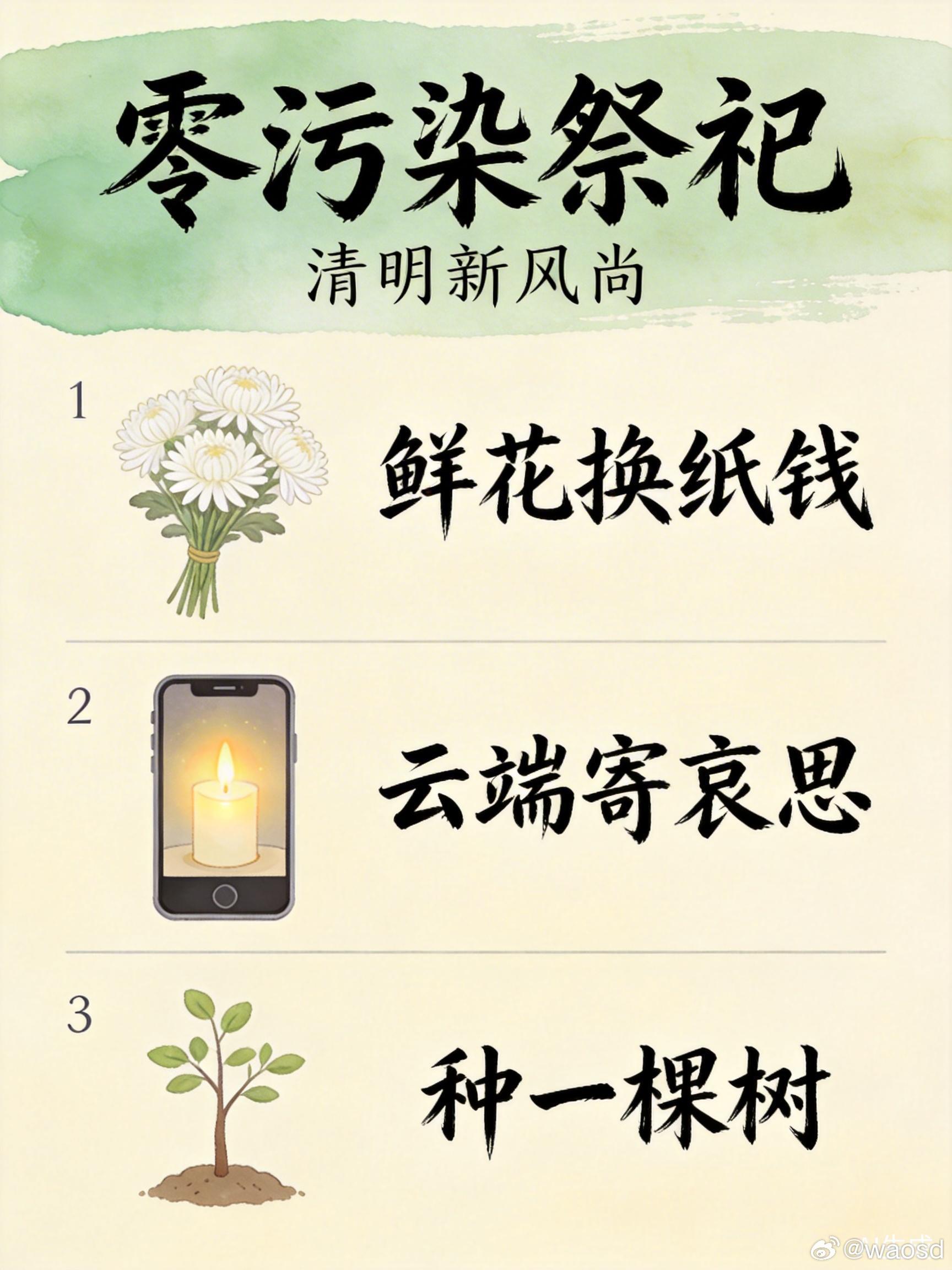 每年清明,全国焚烧纸钱产生的二氧化碳超过100万吨——相当于烧掉了3000万棵树一年的吸碳量祭扫在心不在形。今年,世界可持续发展科学院整理了3种零污染祭祀方式,既传承文化,又守护绿水青山👇🌸 方式一:鲜花换纸钱一束菊花、几枝柳条,放在墓前同样能表达思念。很多陵园现在都有"鲜花换纸钱"活动,既环保又雅致。📱 方式二:云端寄哀思"云祭扫"不是敷衍,而是让思念跨越时空。写一段文字、点一盏电子烛光,把对先人的怀念留在心里,而不是空气中。🌳 方式三:种一棵树在故人墓前种下一棵小树,让它代替纸钱年年生长。这才是真正的"生生不息"。